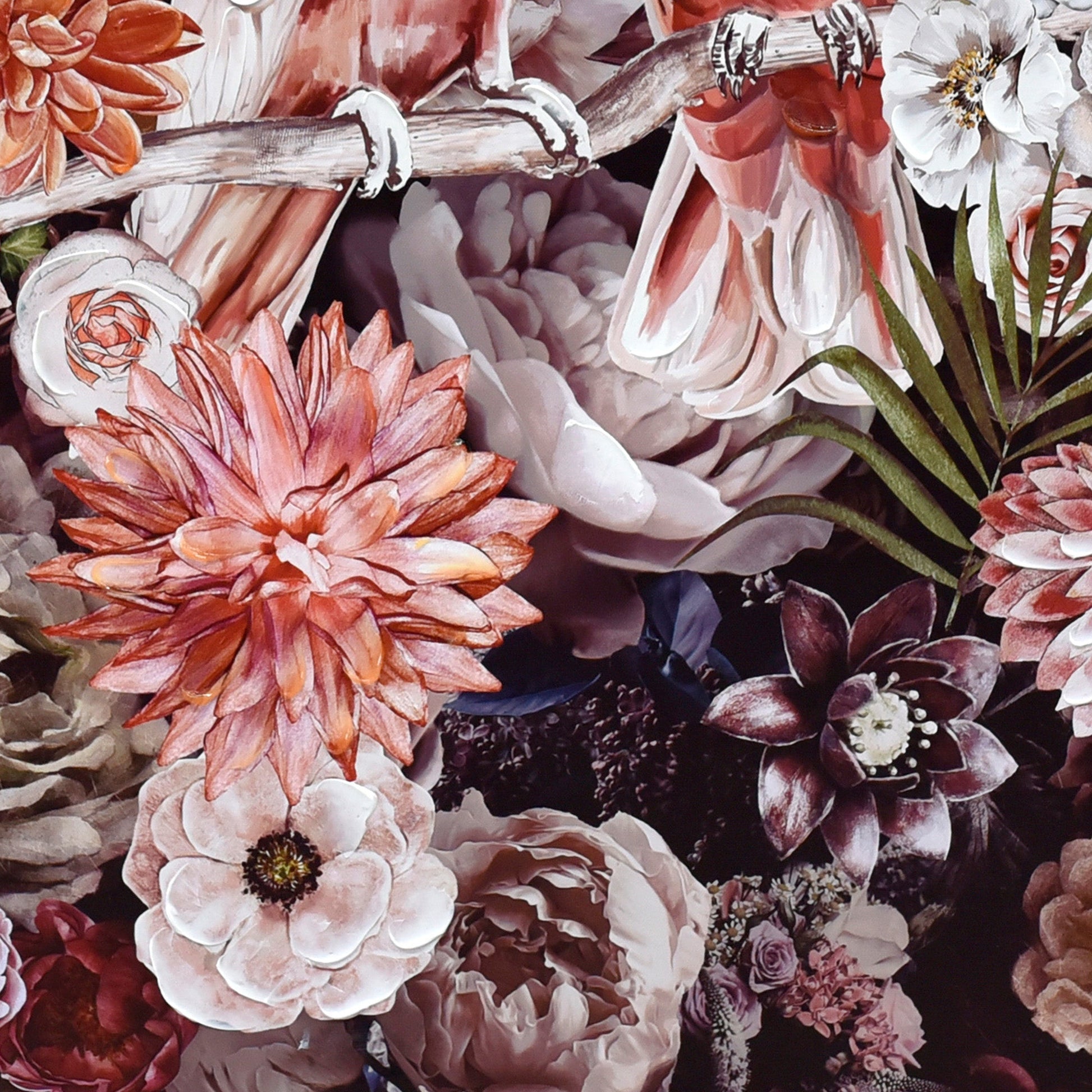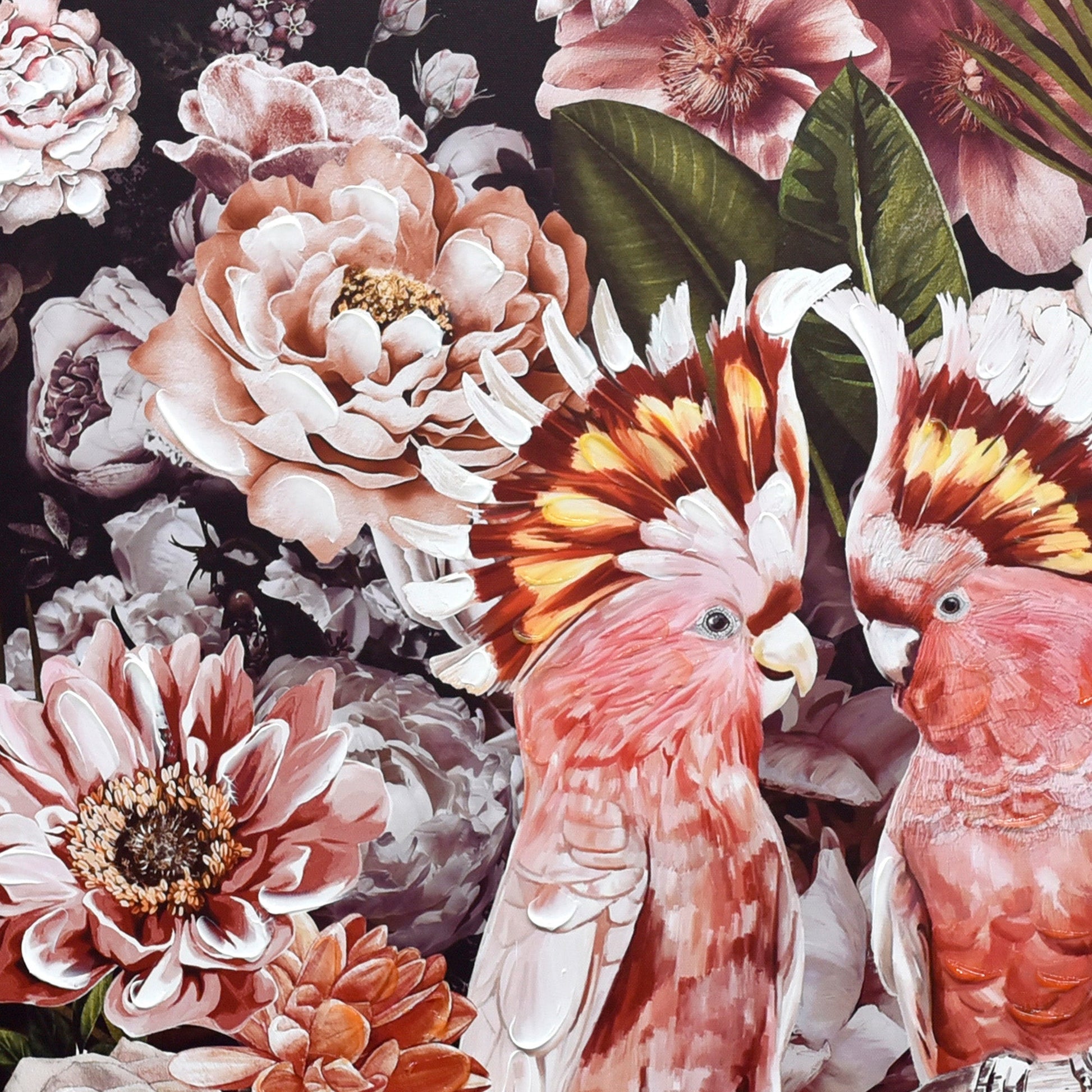 Dive into a world where love and nature intertwine in "Cockatoo Romance." This 100cm x 100cm artwork showcases a tender moment between two pink cockatoos, perched on a branch, their gaze locked in a gentle embrace. Their vivid pink tones stand out against a backdrop bursting with flowers, covering the canvas in a lush tapestry of reds and other dark tones. Every petal, feather, and leaf is brought to life with a combination of hand-painting and print, resulting in a perfect blend of precision and artistic flair. The gold frame elevates the artwork, adding a touch of opulence to the already rich composition. "Cockatoo Romance" is more than just a depiction of nature—it's a celebration of love, beauty, and the vibrant hues of life.