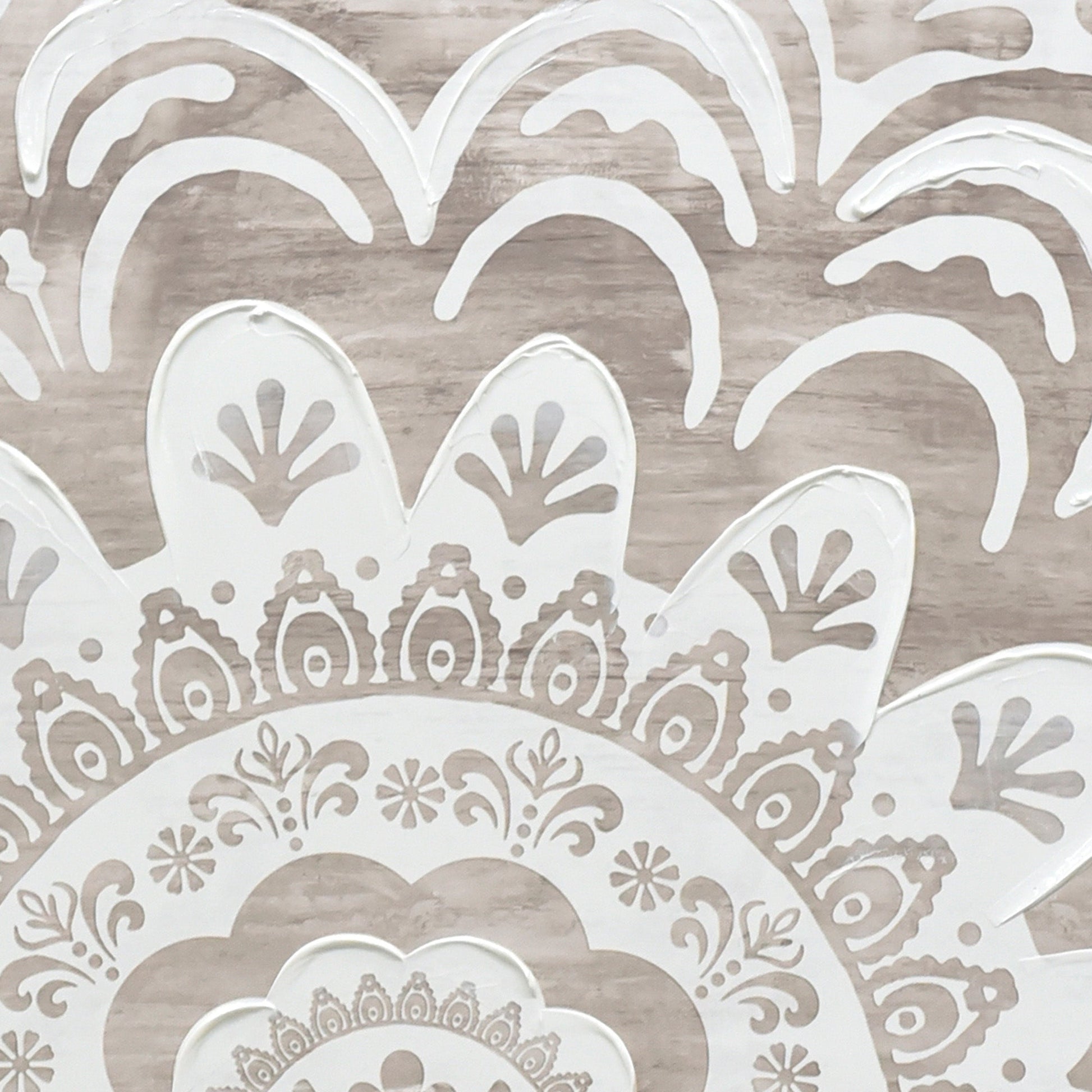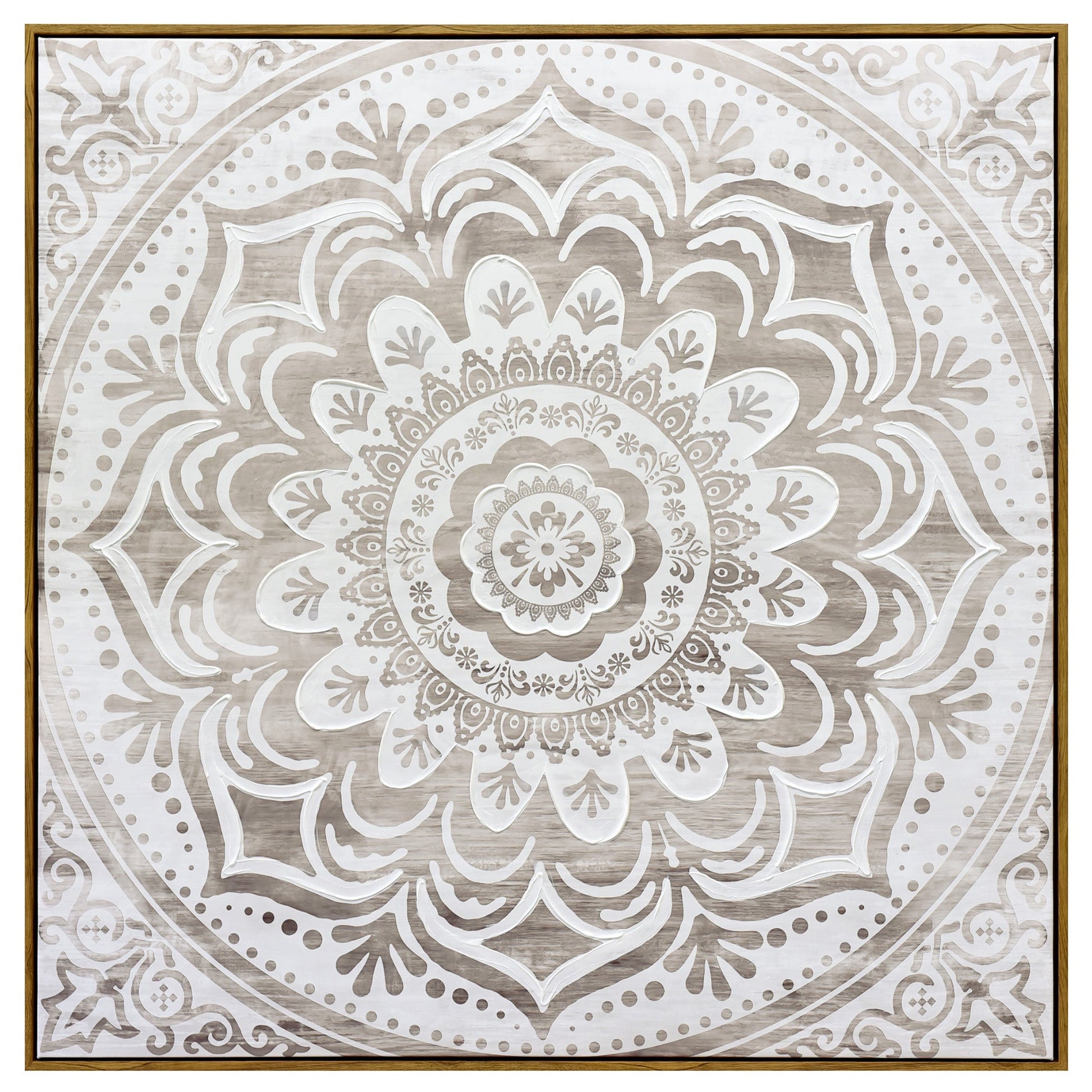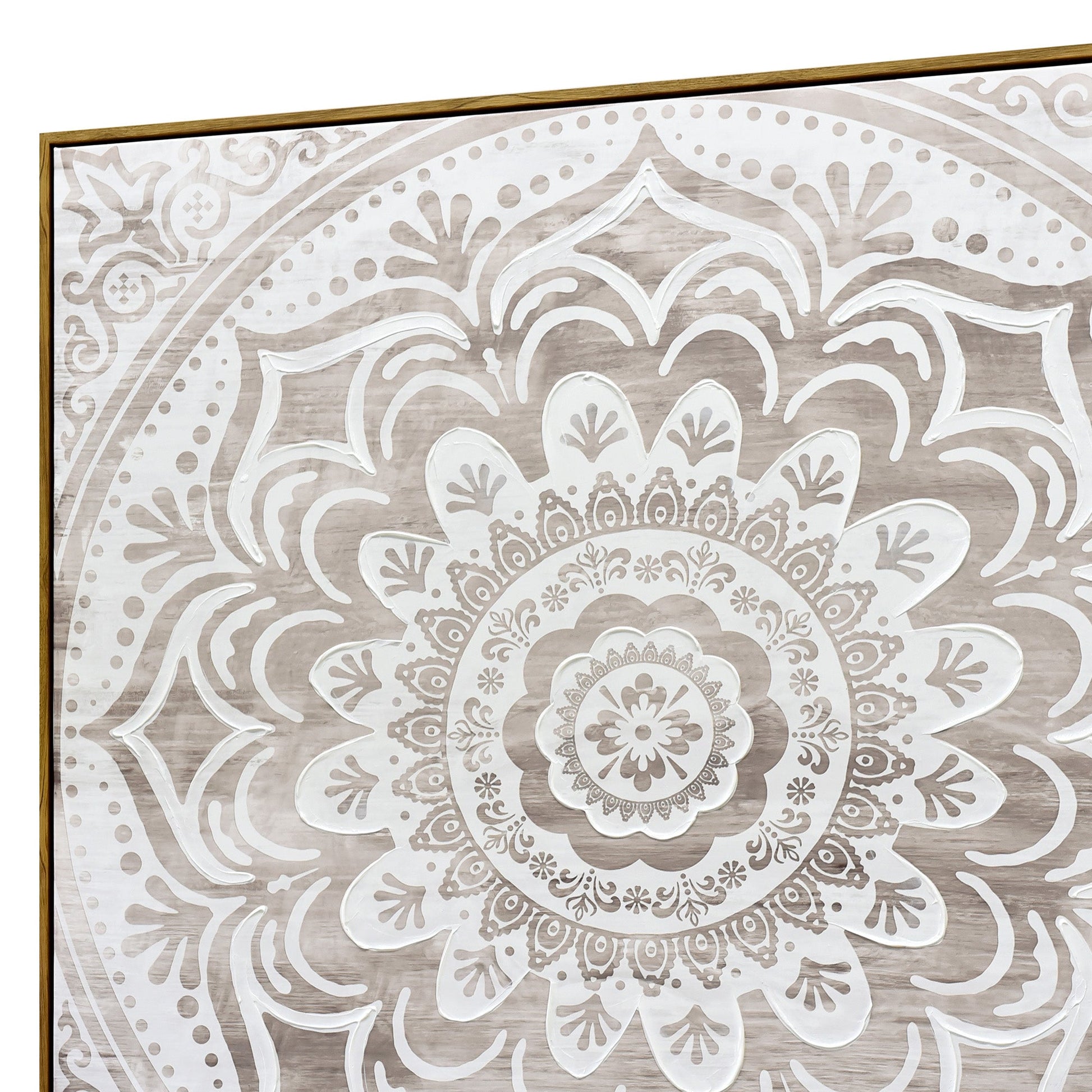 Immerse yourself in the soulful allure of "Earthy Emanation," a 100cm x 100cm masterpiece that embodies the spirit of ancient artistry and modern craftsmanship. At its core lies a beautifully designed mandala, an emblem of the universe, meticulously crafted with intricate patterns that radiate from the center and stretch outward. Each detail of the mandala shines in earthy monotone shades, a harmonious blend of tradition and elegance. Set against a pristine white canvas, the mandala becomes a focal point, inviting viewers to lose themselves in its mesmerizing maze of patterns. The combination of hand-painting and print techniques lends depth and texture to the artwork, creating a rich tapestry of symbols and motifs. Framed in sophisticated dark wood, "Earthy Emanation" is not just a piece of art—it's a reflection of the timeless beauty and complexity of the world around us.