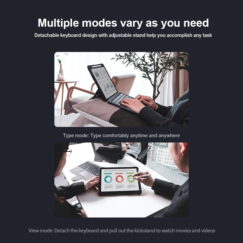 • Multi-function keyboard case with adjustable stand, removable keyboard, and trackpad