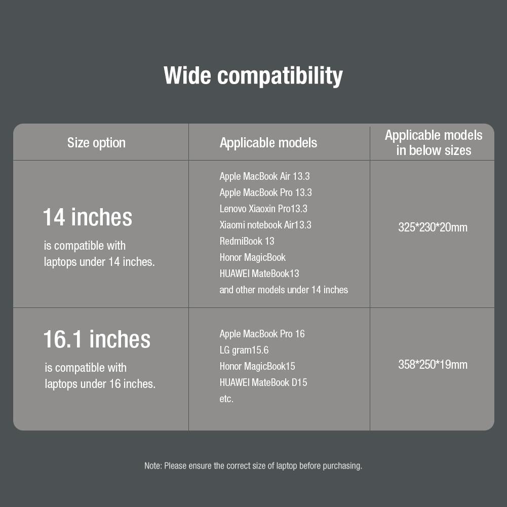 • Size: 14 inches: 365x260x27mm, 16 inches: 390x290x30mm
