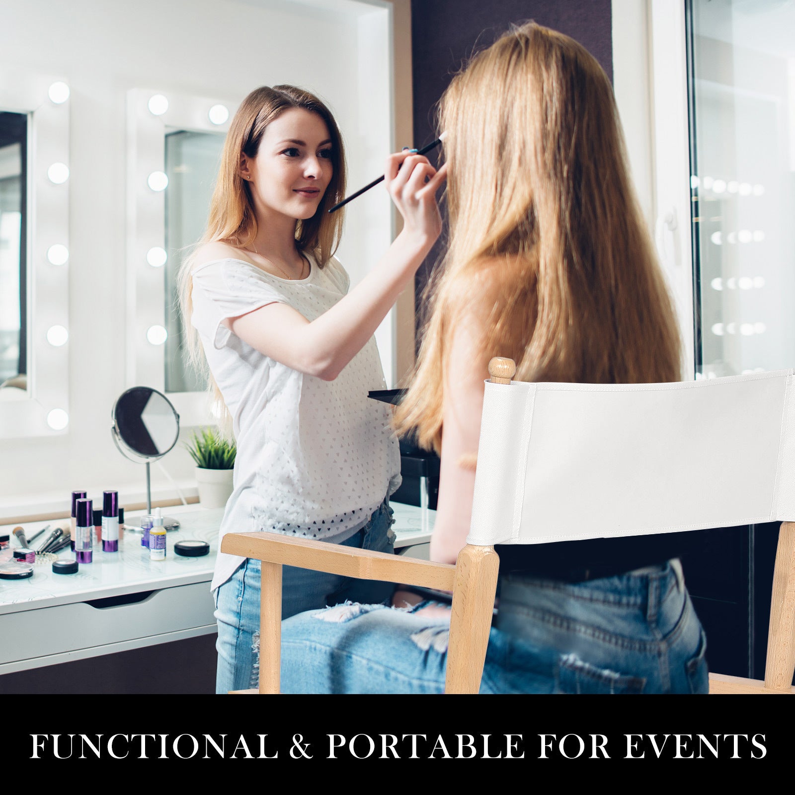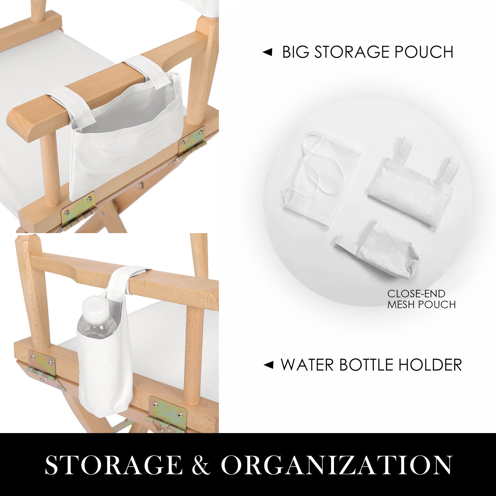 Besides, there are two detachable side bags and large storage for your beverages or work essentials. It is really ideal for makeup! And when it's a wrap, just fold the lightweight Chair away for easy transport or storage.