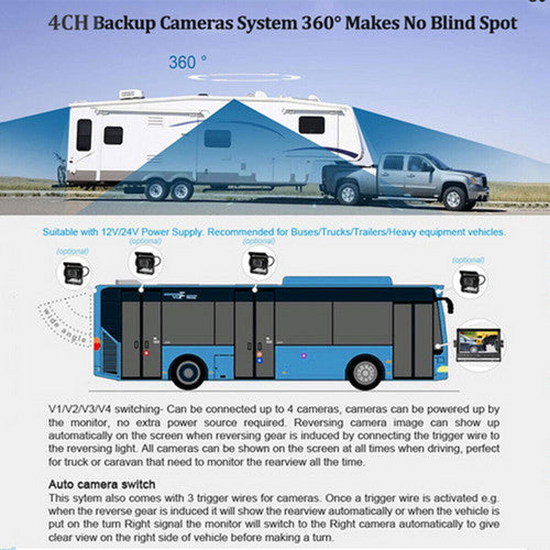 Wide Adaptability:Designed specially for RV truck box truck semi truck travel trailer bus heavy duty camper tractor the 5th wheel motor home,etc. Using 12-24V voltage, this rv camera system can be used on all vehicles.