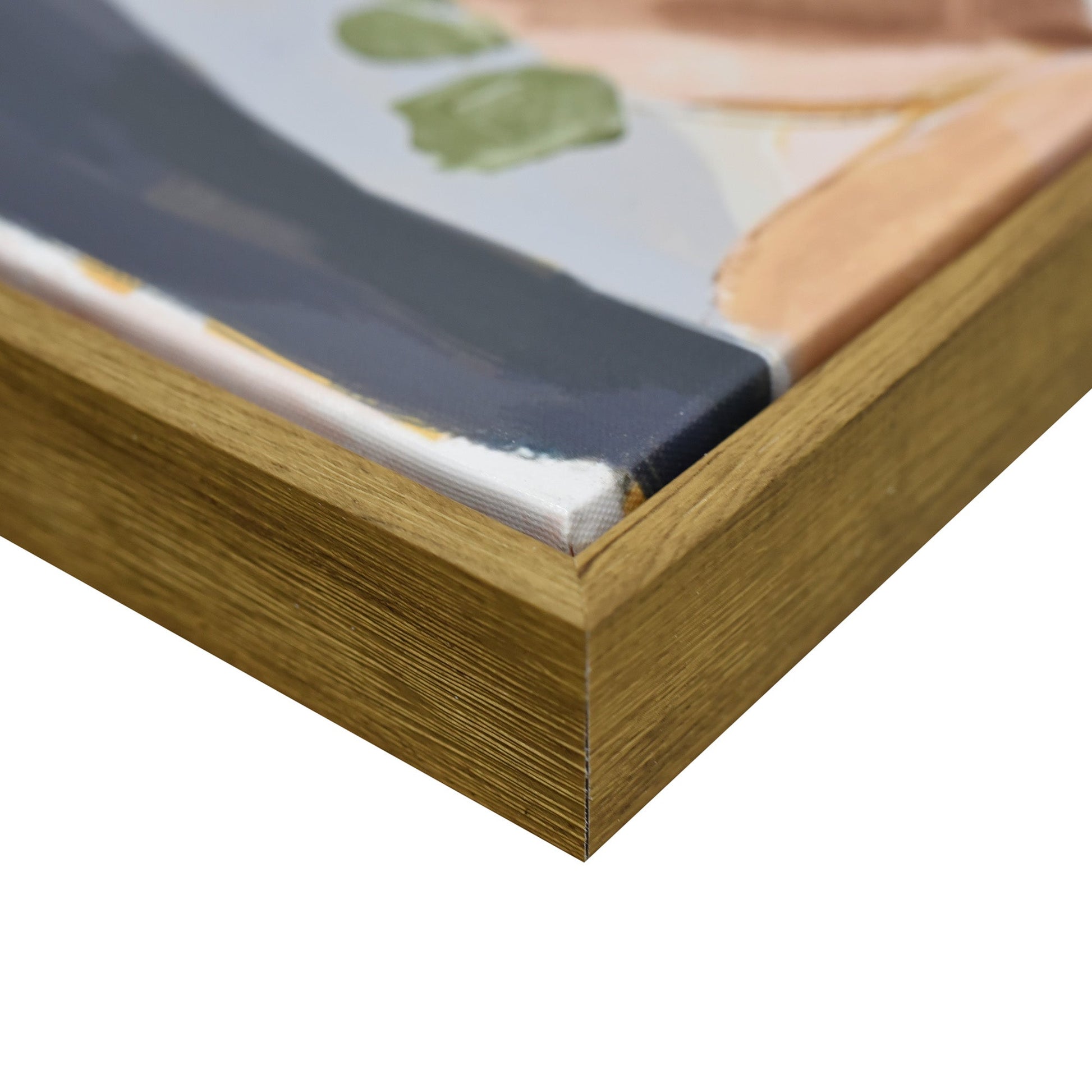 Stretched and gallery wrapped around a wooden stretcher and finished with a floating frame. There is a gap between the frame and print, which creates the floating effect and literally makes the canvas print stand out even more.