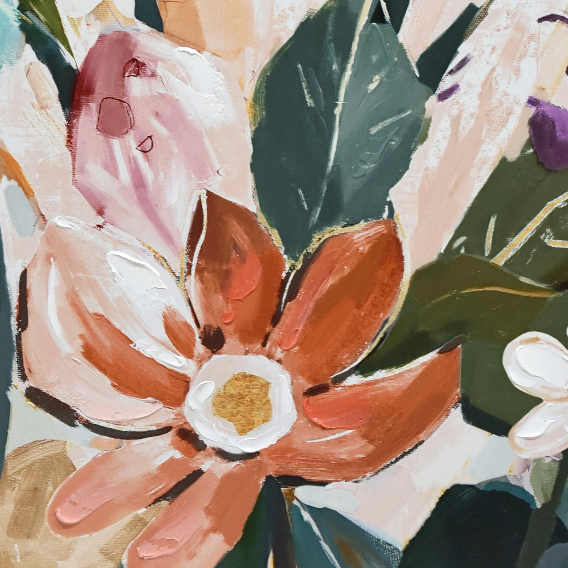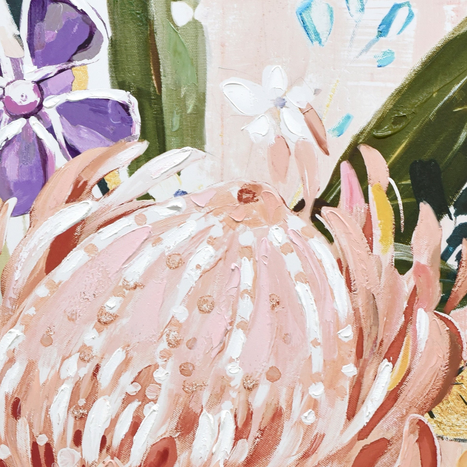 Step into a vibrant realm of nature with "Native Bloom," a 80cm x 120cm artwork that celebrates the beauty and diversity of native flowers. Bursting with color, each bloom stands out, showcasing the rich palette of hues that only nature can offer. The meticulous blend of hand-painting and print brings out the intricate details of each petal, leaf, and stem, making the flowers come alive against the canvas. Encased in a sophisticated dark wood frame, this floral masterpiece is not just a visual treat—it's a tribute to the timeless charm and allure of nature's creations. Whether you're a lover of botany or simply appreciate the beauty of colorful blooms, "Native Bloom" is sure to captivate and inspire.