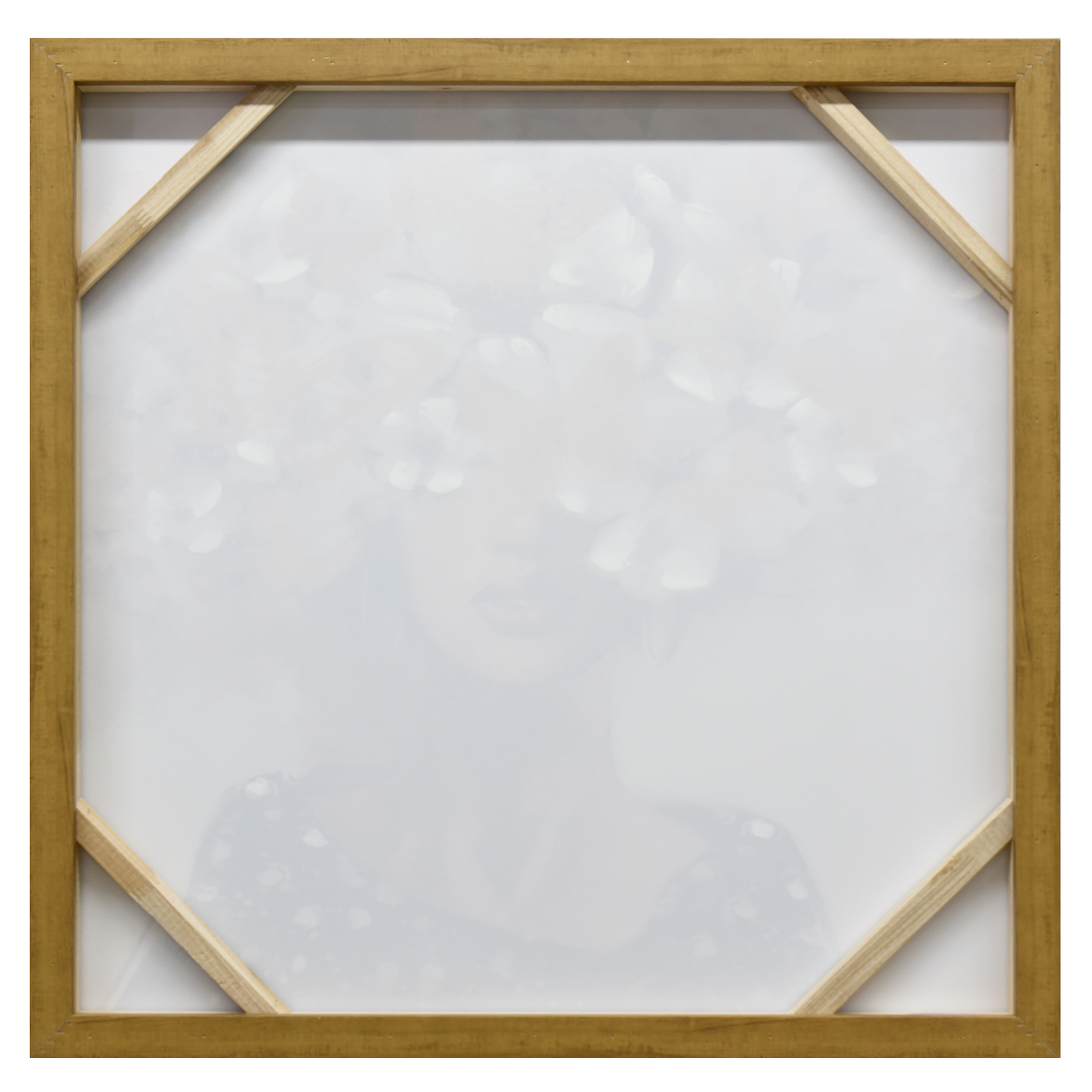 "Floral Fantasia" is a mesmerizing fusion of the human form and nature's bounty. At its core lies the portrait of a woman, her features beautifully accentuated with striking lipstick and a chic black top adorned with white spots. But what truly captivates the viewer's gaze is the cascade of white flowers that replaces her tresses, flowing in a dreamy abundance and covering the top half of the canvas, hiding her eyes. These blossoms are brought to life with the ethereal presence of gold butterflies, adding a touch of whimsy and wonder. Crafted with a harmonious blend of hand-painted details and print, the artwork is framed within dark fir wood, grounding its ethereal elements. "Floral Fantasia" isn't merely a portrait; it's an enchanting tale of beauty, mystery, and nature's magic.