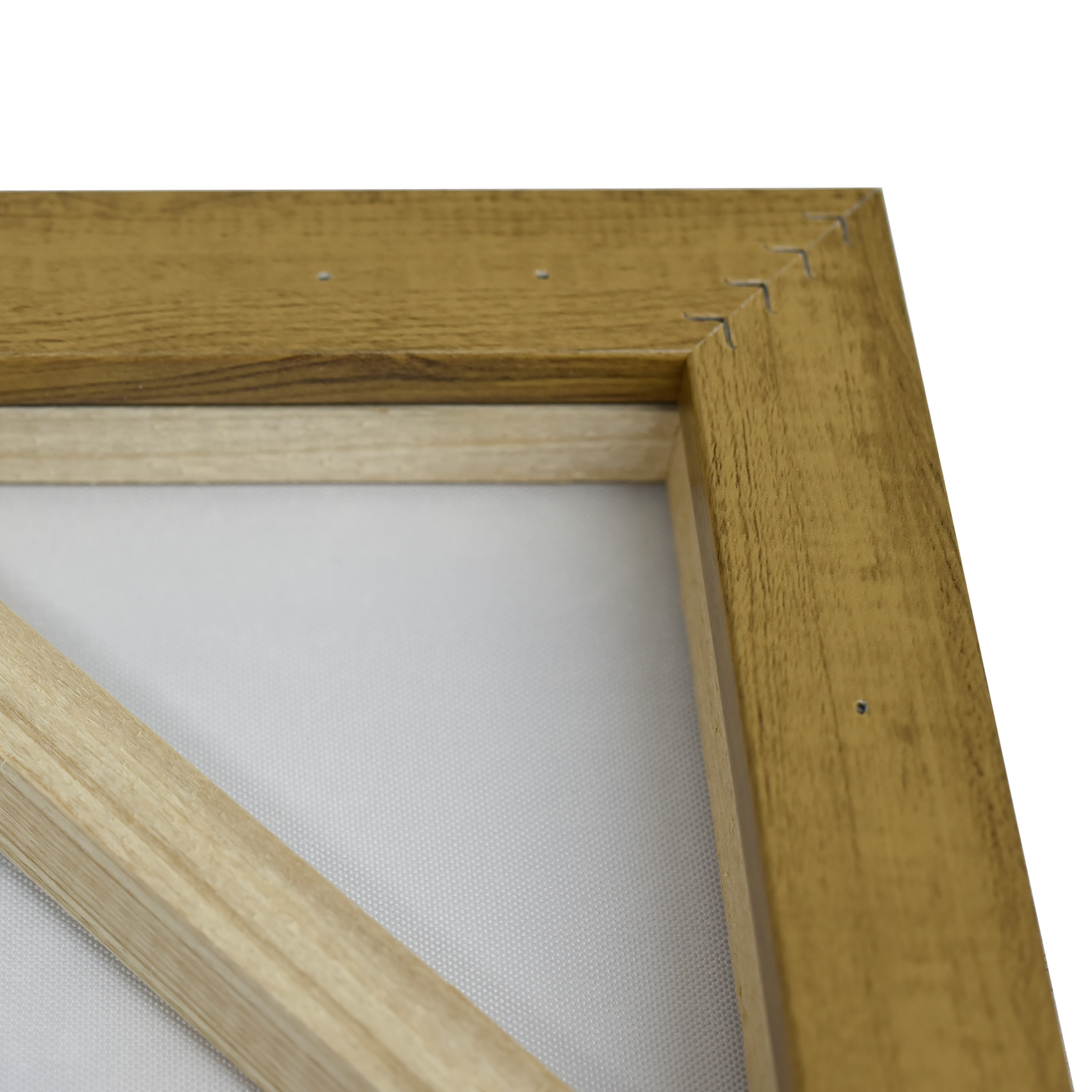 Stretched and gallery wrapped around a wooden stretcher and finished with a floating frame. There is a gap between the frame and print, which creates the floating effect and literally makes the canvas print stand out even more.