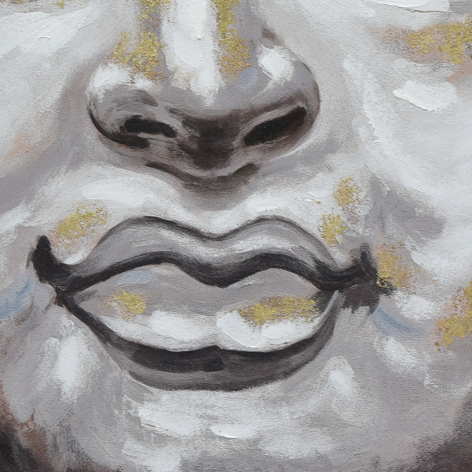 "Serene Radiance" is an evocative portrayal of spiritual tranquility, capturing the essence of Buddha in a close-up, almost intimate rendering. Bathed in soft hues of light grey and white, the visage exudes an aura of peace and introspection, amplified by the closed eyes that hint at deep meditation. The gold highlights delicately accentuate the facial contours, adding a touch of opulence to the subdued palette. This ethereal face occupies the majority of the canvas, with the three-quarter positioning allowing for a glimpse of the serene light blue backdrop on the right. The choice of a champagne frame complements the artwork, elevating its elegance. Crafted with a blend of hand-painted and printed techniques, "Serene Radiance" serves as a poignant reminder of the inner peace that lies within, beckoning viewers to pause, reflect, and find solace.