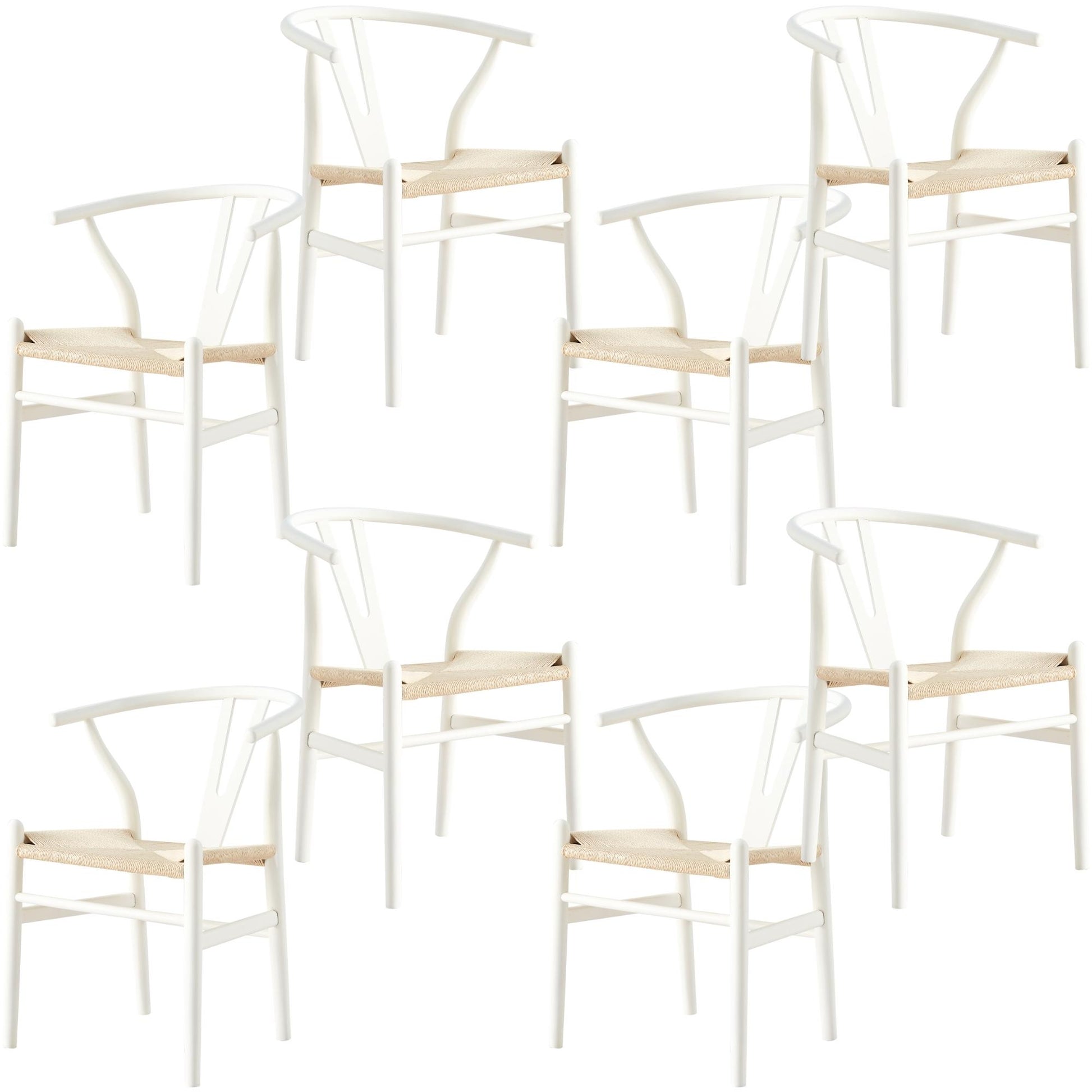 A classy dining chair enhances mealtime delight. Feel it by decorating your dining area with this attractive 8-piece set of dining chairs in white, designed in the Scandinavian style. The iconic Hans Wegner Replica Wishbone chairs, featuring timeless curved back and armrest with a hand-woven paper twine seat in natural colour, ensure lasting comfort. Because of their wooden construct, and strong legs, they are a beautiful addition to your dining space. They look stunning in almost any decor settings, thanks to their homely design and sleek style. The beautiful chairs are made of high-quality Beech wood and Recycled Paper Twine, obtained in a sustainable manner. A one-year warranty is included with the fully assembled dining chairs.
