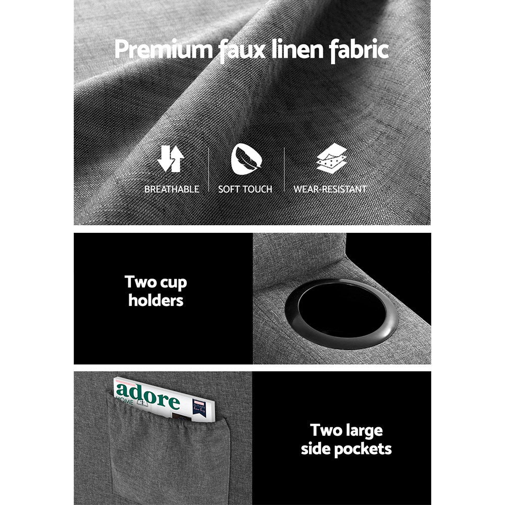 Sit back and relax with the Artiss Recliner Chair. With its 8-point massage and 2-point heating function, the recliner chair enables soothing massages all over the body at all the right places. Upholstered in fine quality faux linen fabric, the recliner is an oasis for plush comfort. The sturdy steel base also allows a weight capacity of up to 180kg. The contoured backrest provides good support with multi-angle tilt adjustment to suit sitting positions for your favourite pastime activities. Plus, an adjustable footrest lets you put your feet up in style. Elsewhere, you will enjoy the ultra-wide armrests, double cup holders and two large side pockets for all your essentials close at hand. Not least, it comes with a handy remote control to turn on everything at your fingertips.