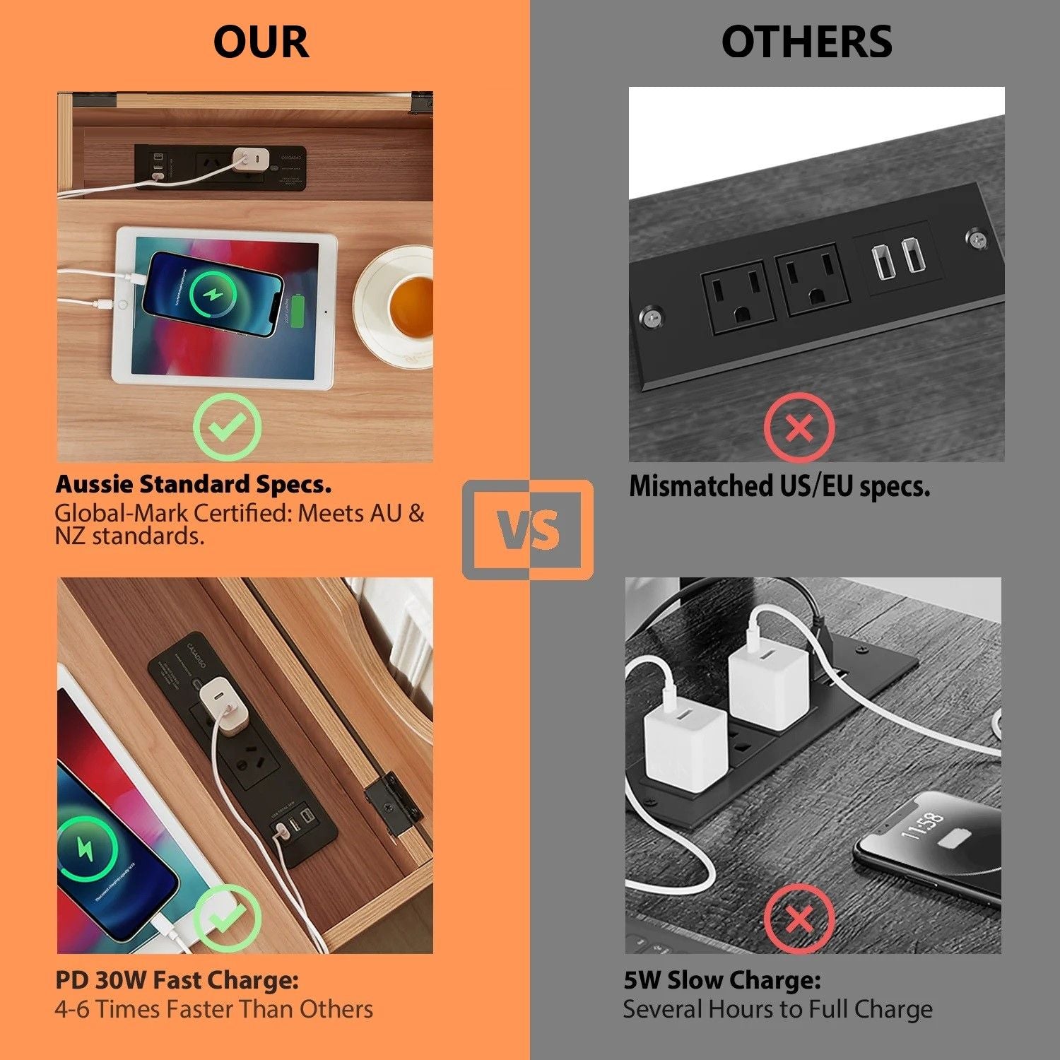 - Enjoy secure, rapid charging with this side table! Certified with Australian Global-Mark electrical safety standards, it features PD30W, USB Type-C, and surge protection. Plus, its 1.78m flame-retardant cord is designed for everyday use, giving you peace of mind and reliability.