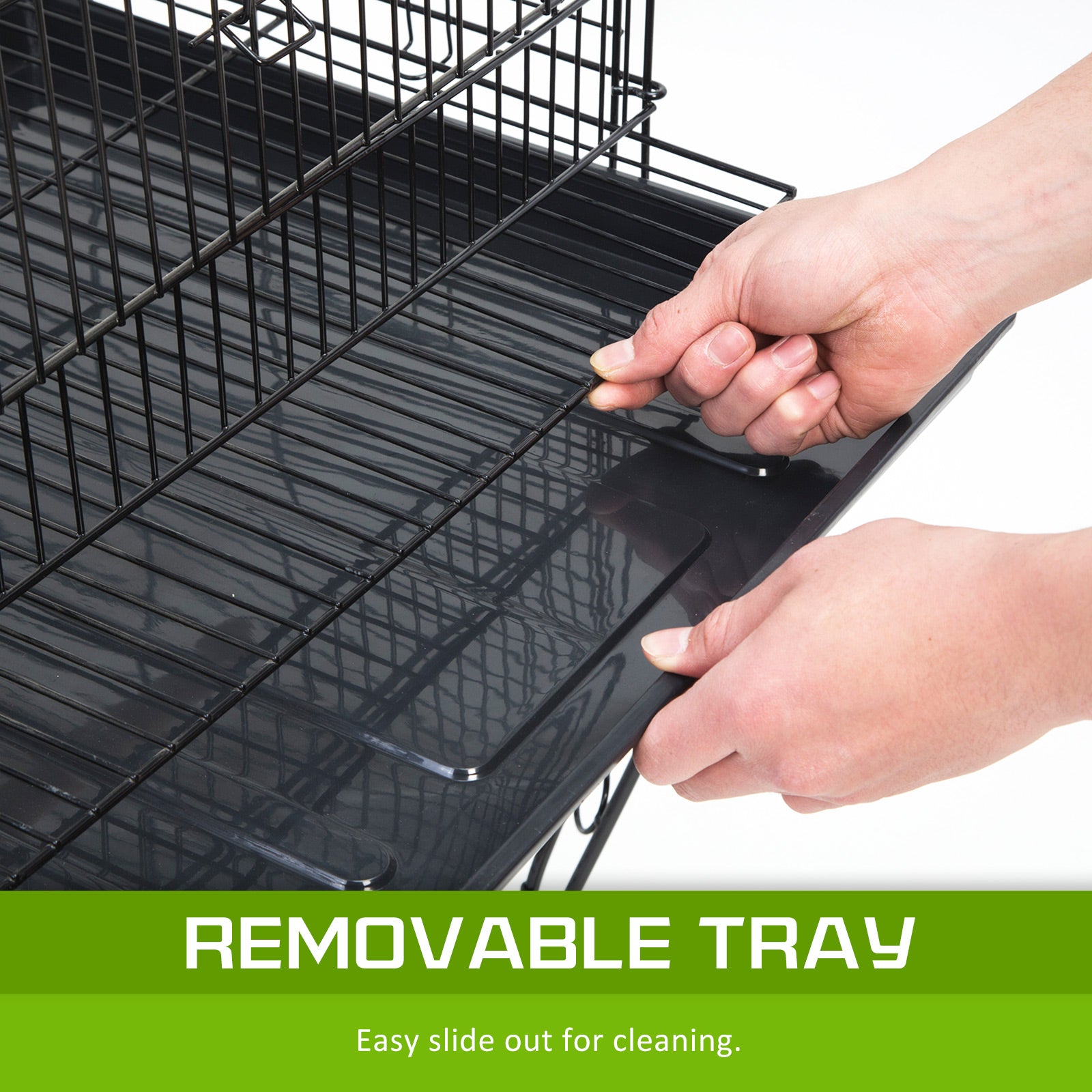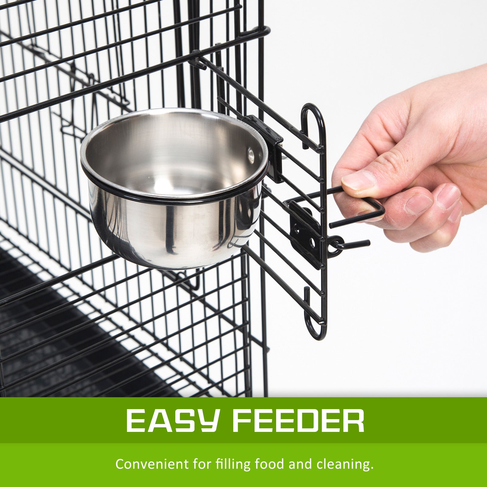 The cage's frame is made of durable and high-quality wrought iron and it is powder coated in order to prevent it from rusting and offer a longer service life. There is one lockable door on the front and one on the top of the cage so you can keep your bird safe and have easy access inside the cage. There is also a removable tray under in order to make cleaning easy. There are four, 360 degree swivel caster plastic wheels so relocating the birdcage is very easy. 2 water/food container and 2 rest wooden perches are included. The cage also has a clever shelf under it so you can store your birds' needs, such as water, food and cleaning tools. Another good feature is that the bird dome on top is removable from the stand so you can place it on top of tables or other places.