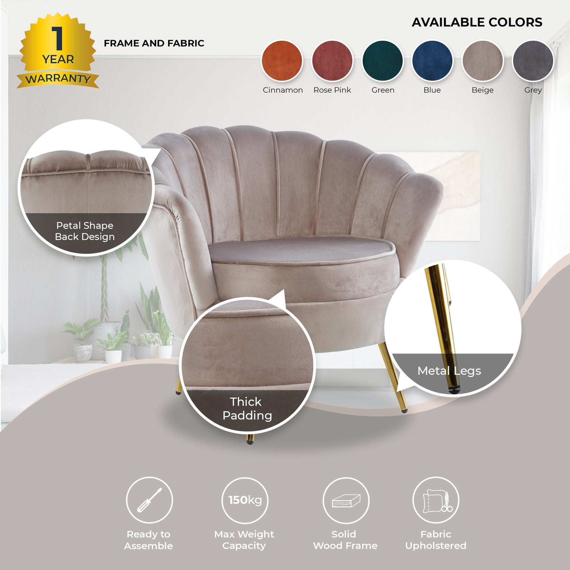 This sofa-chair-ottoman set in beige colour is the perfect relaxation seat. A truly versatile furniture set wherein the sofa chair can be used as a reading chair and the ottoman can be utilized to create extra seating space and can also be used as a footstool, a stool, or even a coffee table. The attractive sofa chair-ottoman set, designed in a modern style, enlivens the comfortable corners of your home. The sofa chair features a plush velvet fabric seat with a petal-shaped back design. The round seat with thick padding gives you the ultimate relaxation when you unwind on it. While the design ensures supreme comfort, its splayed metal legs in a gold colour finish add to its glamorous look. The attractive Ottoman features button tufting details and equally thick padding. Upholstered in a plush velvet fabric, both furniture pieces have a strong framework made of sustainably harvested solid MDF wood and supported by thick foam. Both can bear a maximum weight capacity of 150kg each. A one-year warranty is included with this easy-to-assemble sofa chair-ottoman set.