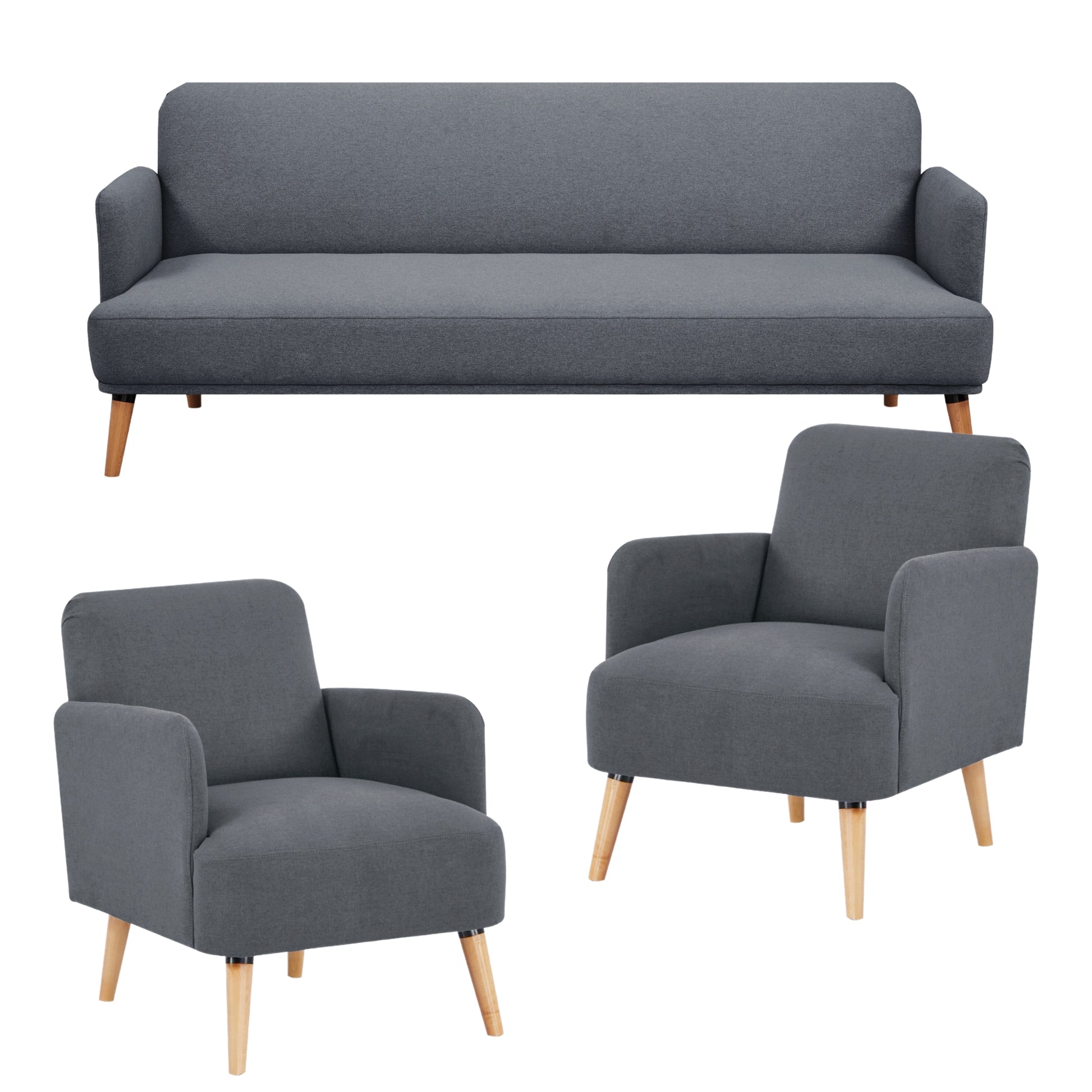 This comfy 3+1+1 seater sofa set in dark grey is a visual feast in itself. The Scandinavian-style furniture is upholstered in a plush upholstery made of high-performance 100% polyester. The upholstery has a smooth fit due to the intact tailoring on the frame. The solid pine wood and plywood frame make the sofas light and highly durable. The durable frame with seating support made of thick bonded foam, fabric, and high-tensile S springs ensures heavenly comfort when you relax on it. Tapered wooden legs in nature wood colour give the furniture pieces a strong base. The sofas with a 3-seater sofa bed are easy to assemble, long-lasting, and come with a 1-year warranty.