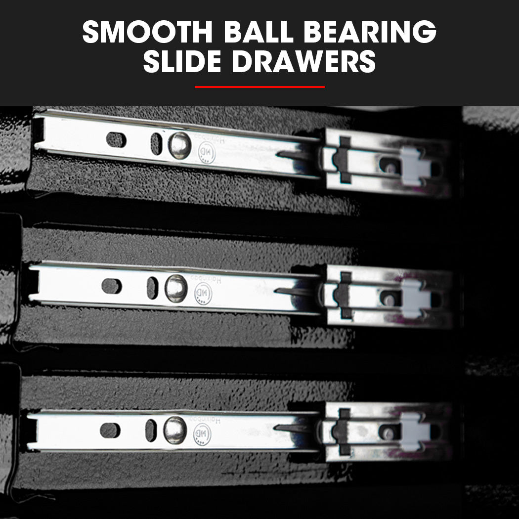 Both the cabinet and chest are built with high tensile powder coated steel enclosures. Equipped with an EVA mat, each drawer slides effortlessly in and out on smooth ball bearing rails, which makes finding and accessing each tool a cinch.