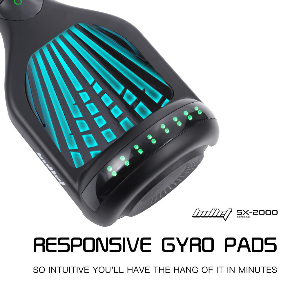 Experience a next level hoverboard with the state-of-the-art Bullet SX-2000. Its high-speed chipset reacts instantly to your bodys movements, offering highly responsive acceleration, turning, and reversing.