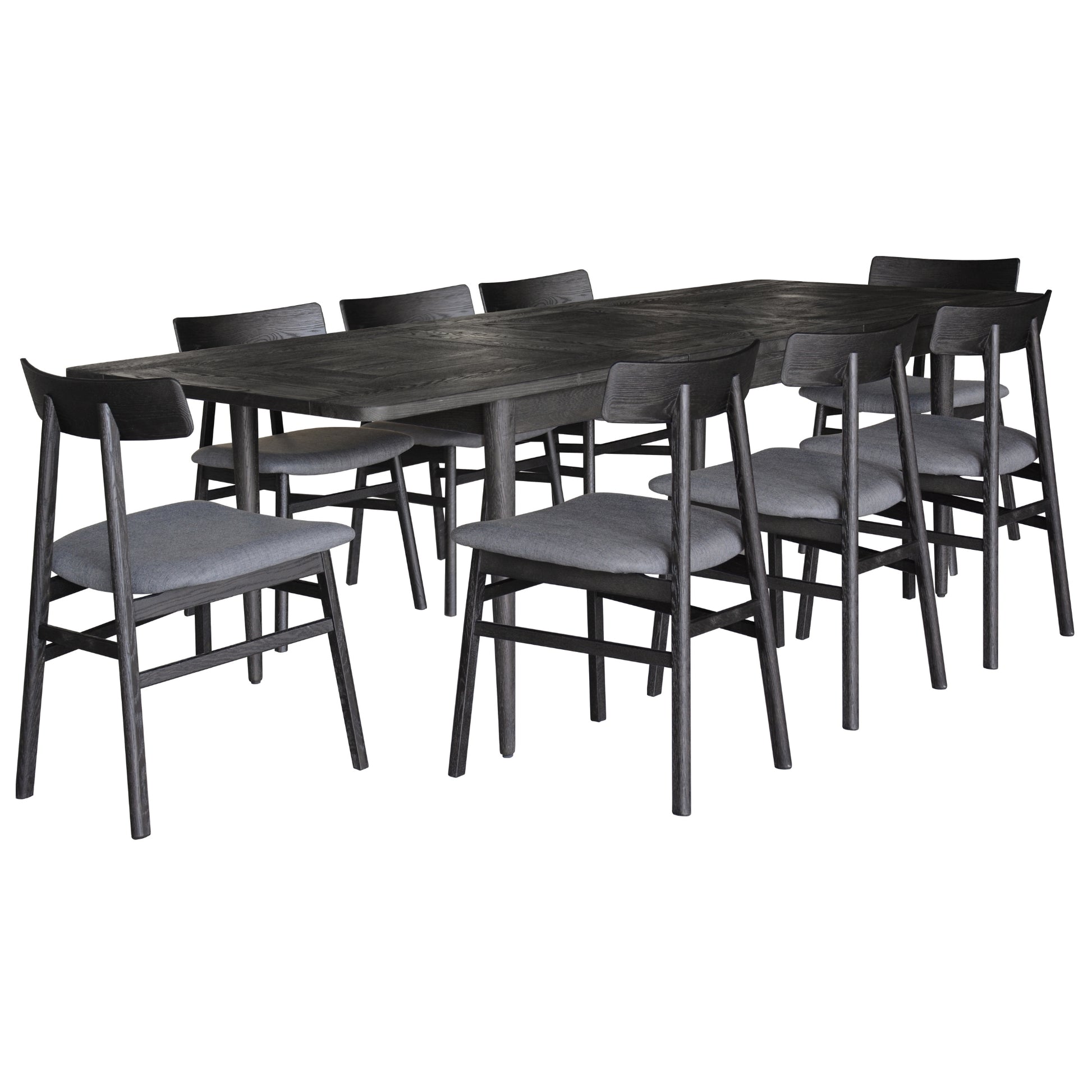 Bring home this lovely dining set in sophisticated industrial style and give your living area the beauty it deserves. The set consists of an extension dining table and 8 chairs. The table in sandblasted black features a geometric parquet pattern on the tabletop that looks gorgeous in a variety of interior decor styles. The 8-seater dining table has strong, tapered legs. The structural frame of the table is made from solid oak, ply, and oak veneer, all sustainably harvested. The woods make the table strong, and durable. Pair the table with 8-pieces lovely dining chairs with 100% polyester fabric seat in black. The chairs stand out in any decor setting due to their wooden frame and unique back design. The chairs are made of sustainably harvested solid oak wood, with a sandblasted finish in classic black colour. The wood gives the chairs strength and durability. The chairs have a one-of-a-kind appearance, with beautifully designed legs. The fully assembled dining chair and easy to assemble tables come with a one-year warranty.
