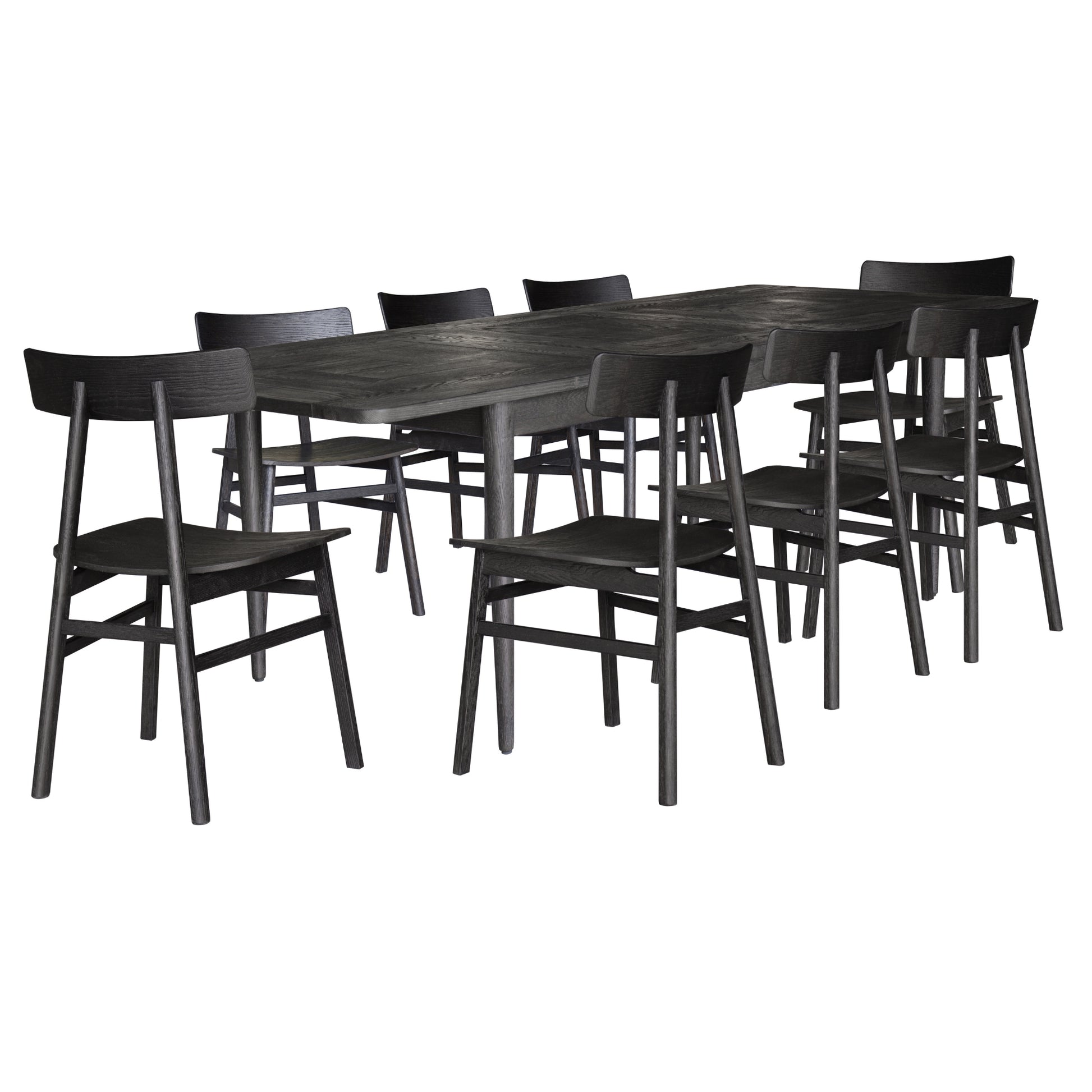 Bring home this lovely dining set in sophisticated industrial style and give your living area the beauty it deserves. The set consists of an extension dining table and 8 chairs. The table in sandblasted black features a geometric parquet pattern on the tabletop that looks gorgeous in a variety of interior decor styles. The 8-seater dining table has strong, tapered legs. The structural frame of the table is made from solid oak, ply, and oak veneer, all sustainably harvested. The woods make the table strong, and durable. Pair the table with 8-pieces lovely dining chairs with timber seat. The chairsstand out in any decor setting due to their wooden construction and unique back design. The chairsare made of sustainably harvested solid oak wood, with a sandblasted finish in classic black colour. The wood gives the chairs strength and durability. The chairs have a one-of-a-kind appearance, with beautifully designed legs. The fully assembled dining chair and easy to assemble tables come with a one-year warranty.