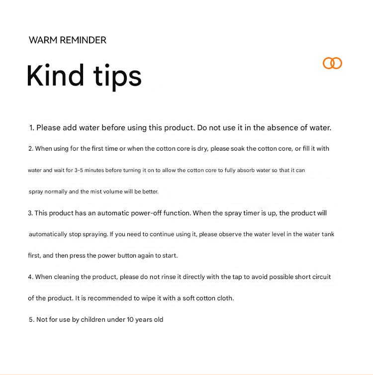 - For first-time use or if the cotton core is dry, soak the cotton core or fill the tank and wait 3-5 minutes for the core to fully absorb water before turning on for optimal mist.