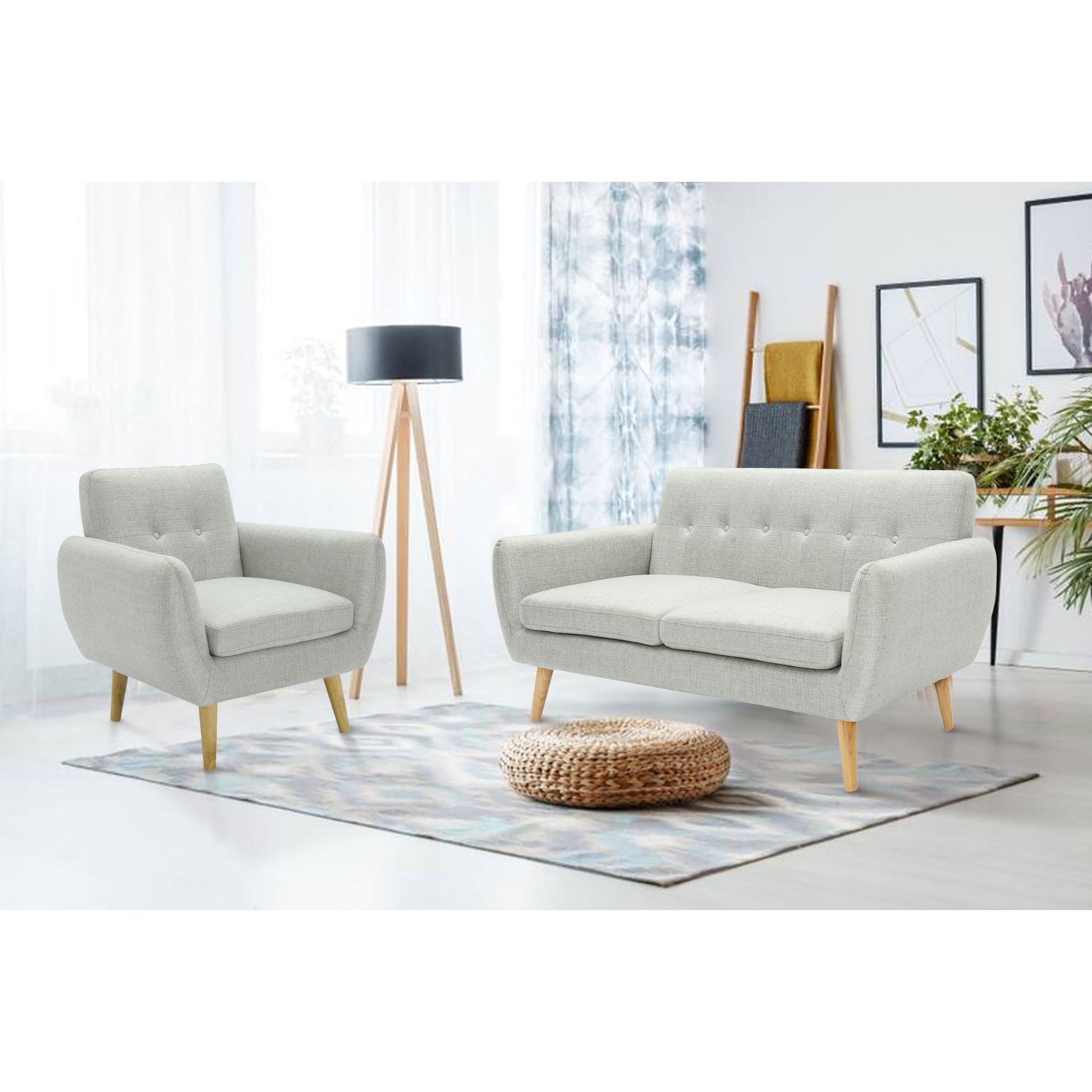 A sofa is the focal point of a living room. Place this beautiful sofa set that consists of a 1-piece 3-seater sofa and a 1-piece 2-seater sofa, designed in the Scandinavian style, in your living room to fill it with elegance. This sofa set is an epitome of superb craftsmanship. They showcase comfy looks, featuring tapered legs and outwardly sloping arms. They have a fixed backrest with button details and loose-style seat cushions with high-density foam for superior comfort. The sofas in light grey mix easily with any interior decor style. The entire sofa is upholstered in 100% polyester fabric, which is soft and durable. The stunning sofas also feature high-density foam, webbing, pocket springs, and S-springs that ensure complete relaxation for the body. The structural frame of the sofa is made of sustainably harvested solid wood and plywood, which gives it internal strength and resilience. The frame has a five-year warranty; the foam and springs have a three-year warranty; the fabric and stitching have a one-year warranty; and all other parts have a one-year warranty.