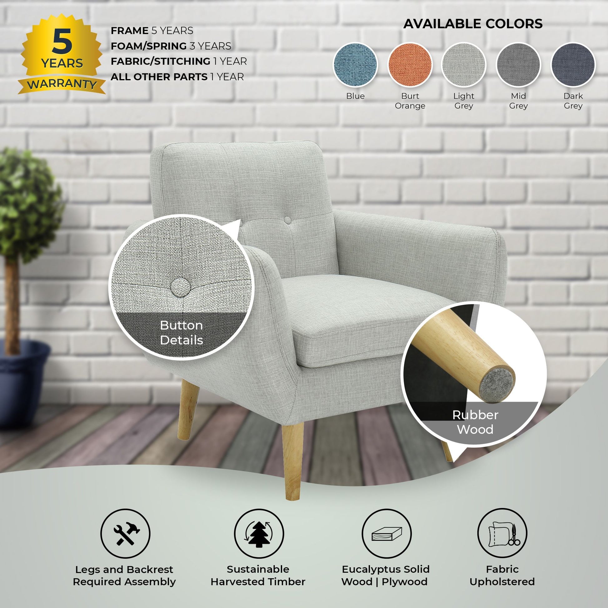 A sofa is the focal point of a living room. Place this beautiful 2-piece set of sofas, designed in the Scandinavian style, in your living room and it will instantly become the most stylish part of your home. The single-seater sofa set is an epitome of superb craftsmanship. They showcase comfy looks, featuring tapered legs and outwardly sloping arms. They have a fixed backrest with button details and loose-style seat cushions with high-density foam for superior comfort. The armchairs in light grey mix easily with any interior decor style. The entire sofa is upholstered in 100% polyester fabric, which is soft and durable. The stunning sofas also feature high-density foam, webbing, pocket springs, and S-springs that ensure complete relaxation for the body. The structural frame of the sofa is made of sustainably harvested solid wood and plywood, which gives it internal strength and resilience. The frame has a five-year warranty; the foam and springs have a three-year warranty; the fabric and stitching have a one-year warranty; and all other parts have a one-year warranty.