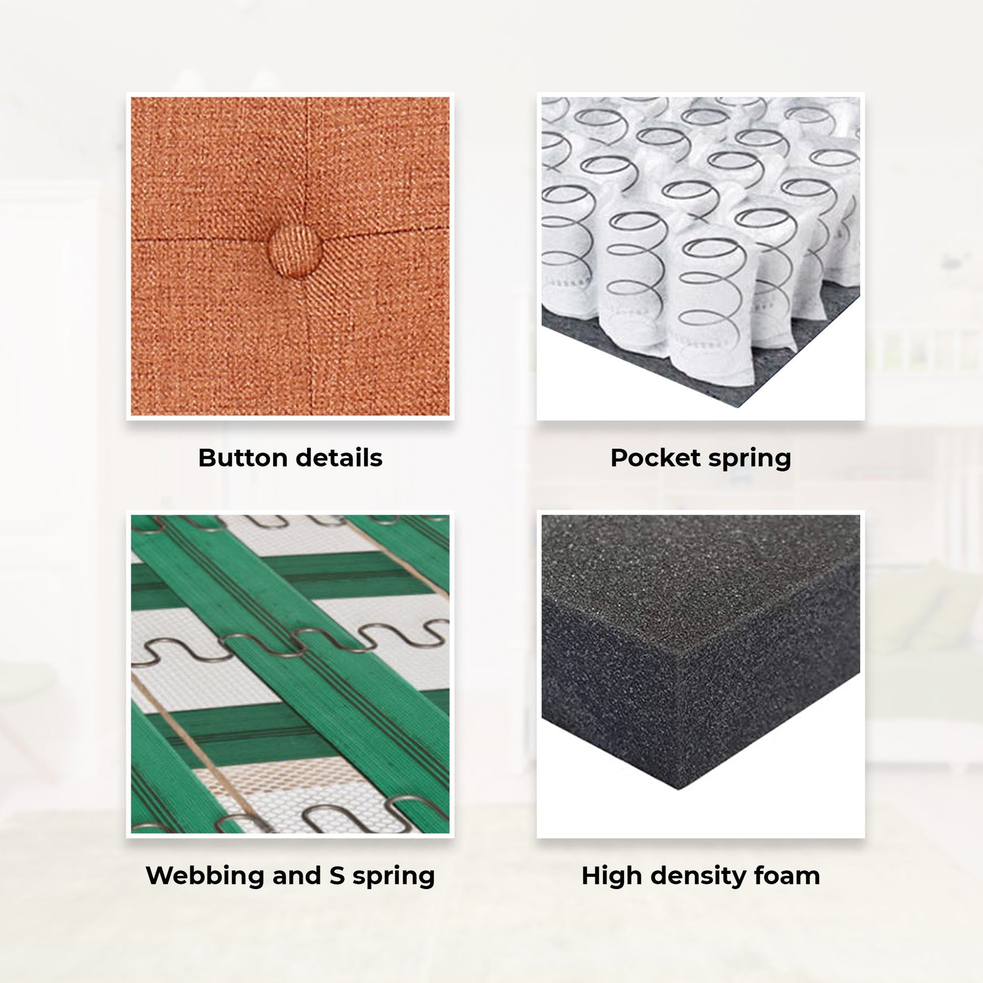 A sofa is the focal point of a living room. Place this beautiful 2-piece set of sofas, designed in the Scandinavian style, in your living room and it will instantly become the most stylish part of your home. The single-seater sofa set is an epitome of superb craftsmanship. They showcase comfy looks, featuring tapered legs and outwardly sloping arms. They have a fixed backrest with button details and loose-style seat cushions with high-density foam for superior comfort. The armchairs in burnt orange colour mix easily with any interior decor style. The entire sofa is upholstered in 100% polyester fabric, which is soft and durable. The stunning sofas also feature high-density foam, webbing, pocket springs, and S-springs that ensure complete relaxation for the body. The structural frame of the sofa is made of sustainably harvested solid wood and plywood, which gives it internal strength and resilience. The frame has a five-year warranty; the foam and springs have a three-year warranty; the fabric and stitching have a one-year warranty; and all other parts have a one-year warranty.