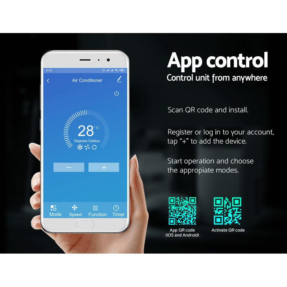 Hot days are not too far away. So why not pick up our Devanti Portable Air Conditioner to help you stay cool comfortably and economically throughout the season. The air conditioner is three appliances rolled into one: air conditioner, 4-speed fan and dehumidifier. There is also an additional automatic water vaporisation system so that you do not need to empty the water tank. The air conditioner rapidly delivers super cool breezes throughout rooms sized 20m² to 30m². In whichever mode you are using, you can always count on ample cool air at your preferred temperature settings. The LED display allows for a clear glance of all your settings. A handy remote control lets you control the settings from the comfort of your lounge, while the Wi-Fi connectivity truly lets you take control from anywhere. The air conditioner can also be set to work for a pre-set number of hours with its 24-hour timer. Built-in handles and castor wheels make the air conditioner very portable so that you can keep cool wherever you are. An included adjustable window exhaust kit enables easy installation of the exhaust hose for hot air to be extracted easily. Do not let the heat and wet get you down this summer. Rise up to a cool and refreshing ambience with our portable air conditioner.