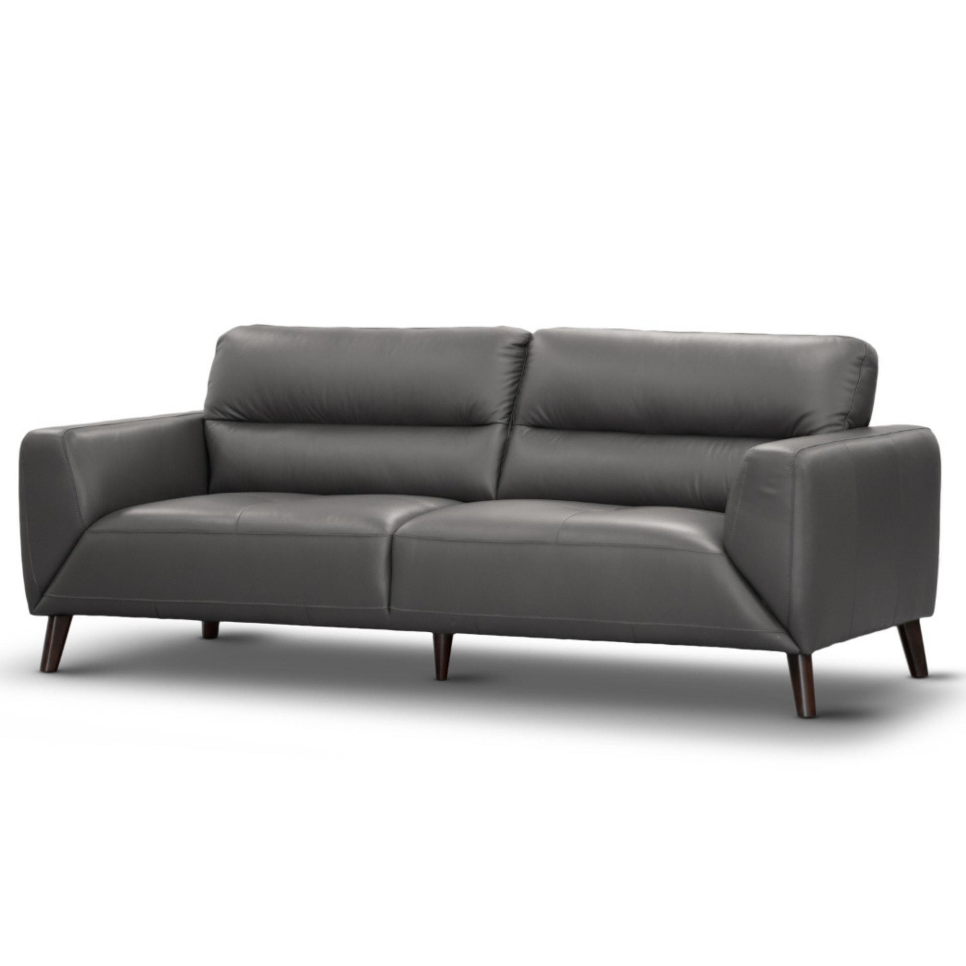 A luxurious lounge set that displays one of the best furniture arts. Place this beautiful sofa set, designed in a modern style, in your living area and see it become the most lovable corner of the house. The adorable set of 3-seater and 2-seater lounges features quilted seat details with super comfy lumbar support. The S-springs, webbing, and dense foam make the seats worth it. You can feel it when you sit or stretch your body on the lounge. The lounges have thick cushioning for added comfort, and they are upholstered in a 100% leather cover in gunmetal colour. The colour blends easily with any home interior theme or living space design. The stunning sofas also feature strong, timber legs. The structural frame of the lounge is made of sustainably harvested solid timber and plywood, giving it solid internal strength and making it durable. The frame has a five-year warranty; the foam and springs have a three-year warranty; the leather and stitching have a one-year warranty; and all other parts have a one-year warranty.