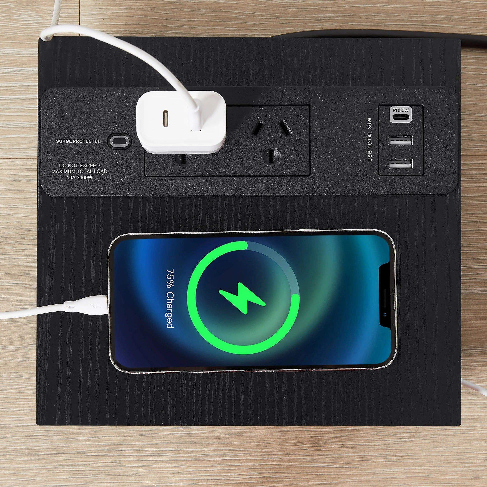 - Save space and stay powered with this great bedside table! This sleek black table is perfect for Australian homes, offering a modern solution to charging needs with its built-in power board. Its compact design makes it ideal for small living spaces, bedrooms, or hallways, so you can keep your devices charged without sacrificing precious floor space.