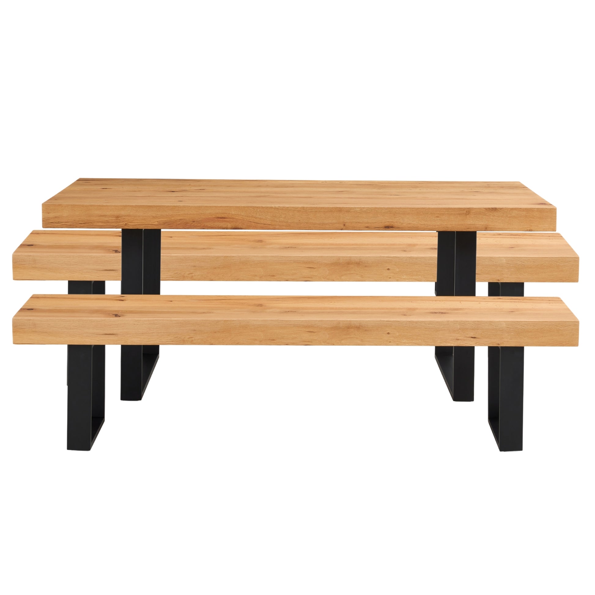 This sleek and beautiful dining set has all the qualities to become the central attraction of your dining area. It consists of one 8-seater dining table and two 4-seater seating benches. The dining table and benches, designed in the industrial style, have a robust, 9-cm-thick tabletop and metal legs in a classic closed design. They are made of sustainably harvested solid and veneer oak with natural grain patterns that give the furniture a natural beauty. Painted in a natural finish, the table and benchtops are paired with powder-coated matt black legs. The elegant furniture pieces have a one-of-a-kind design with a top and legs in different colours and styles. A one-year warranty is included with the simple-to-assemble set.