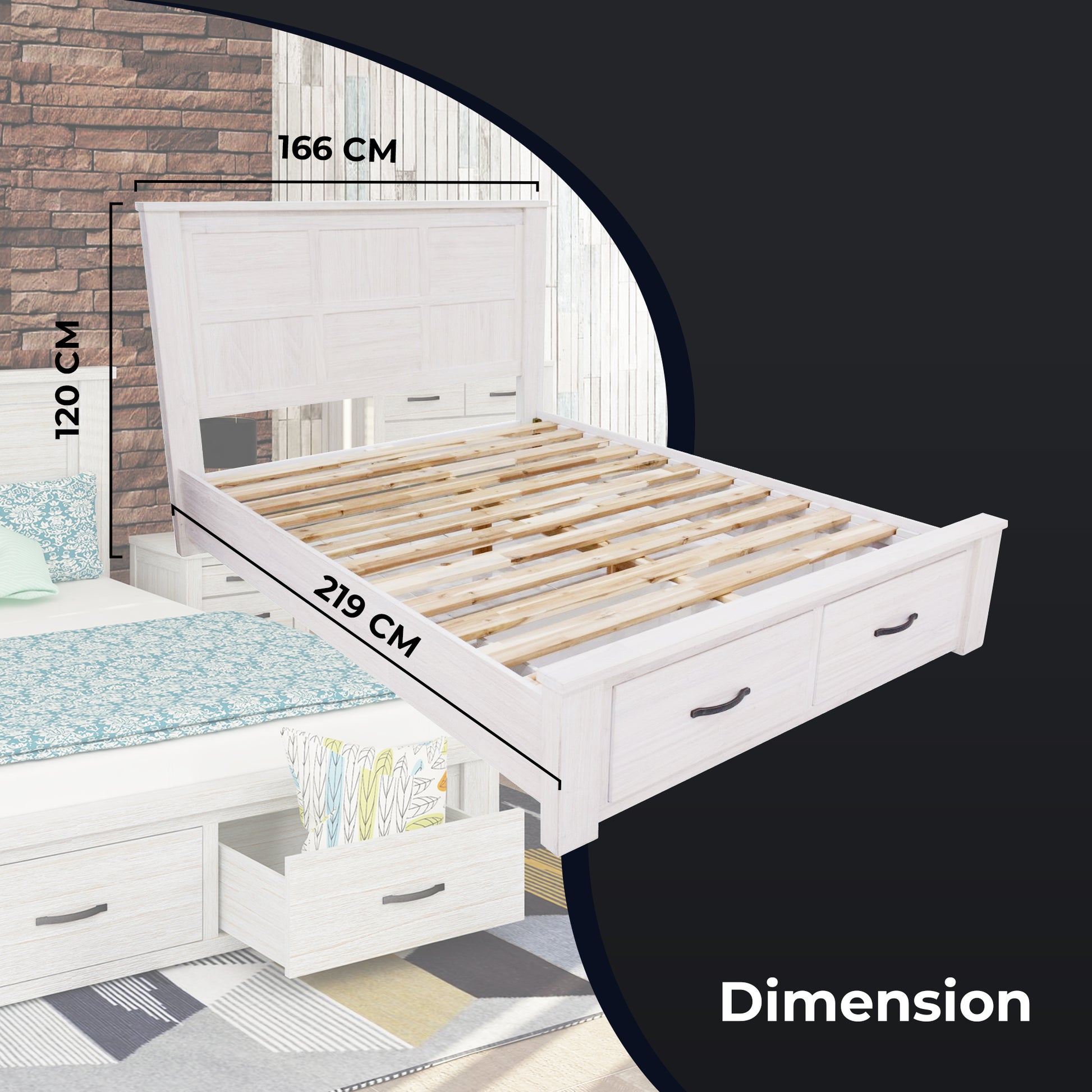 - Queen size bed with 2 large storage drawers