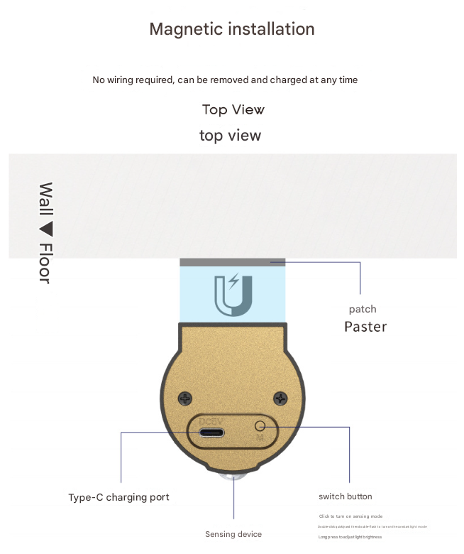 - Magnetic & Wireless Installation: No drilling or wiring needed! The light features a strong magnetic base that attaches to the included adhesive metal paster. Simply stick the paster to any smooth surface and attach the light. Easily remove the light for recharging via its Type-C port.