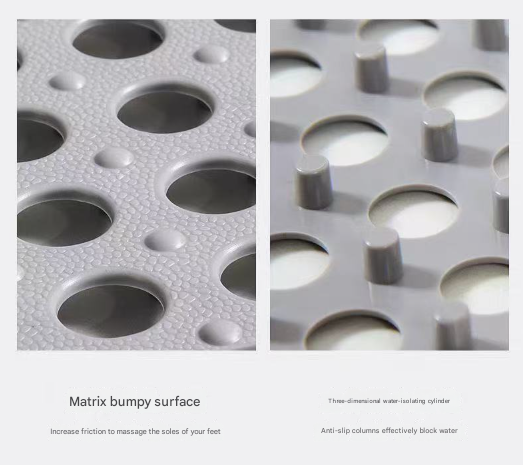- Rapid-Drainage Design: Engineered with large drainage holes and elevated by sturdy support columns, these mats allow water to flow through and away quickly. This prevents water from pooling, reduces soap scum buildup, and helps keep your floors dry and clean.