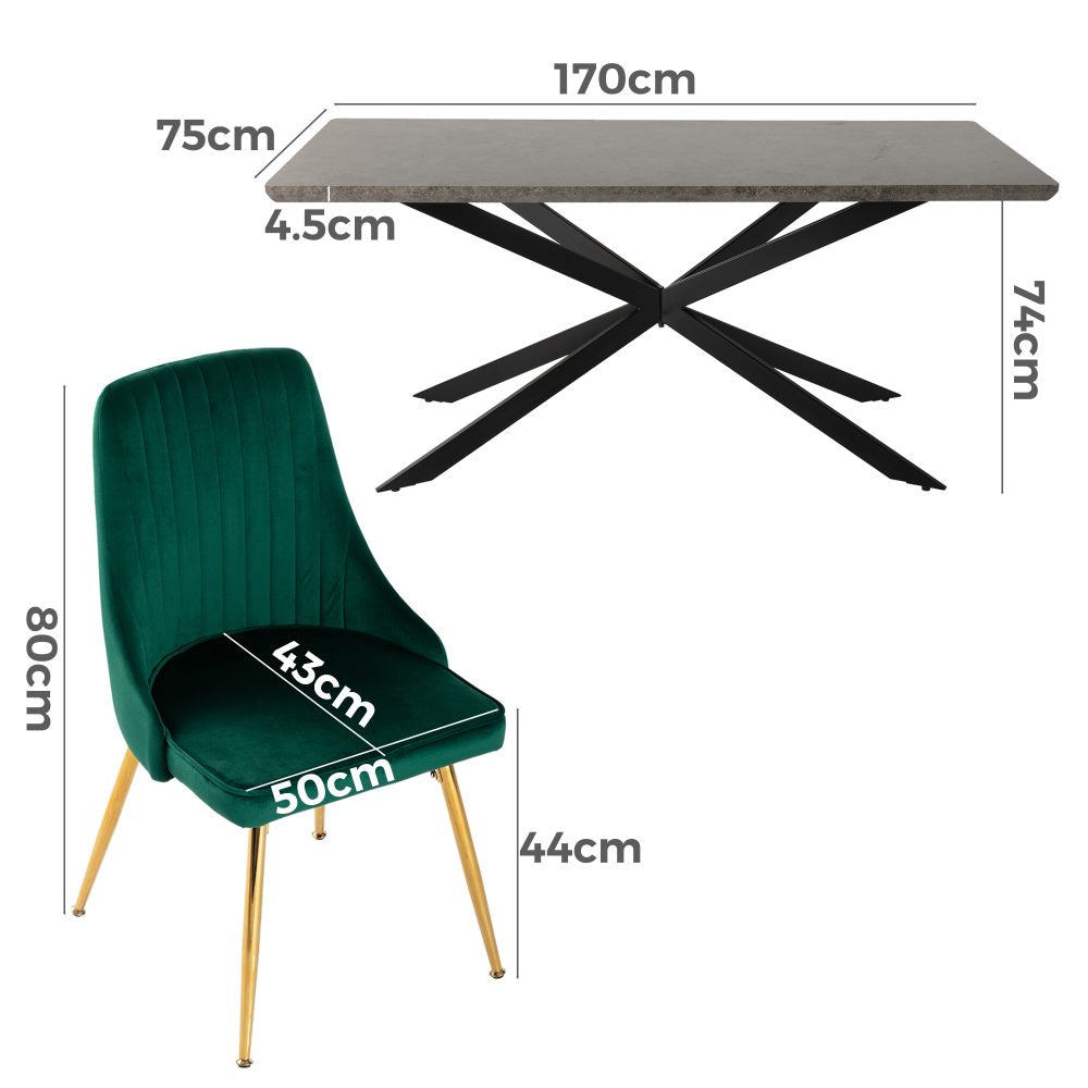 Take a look at our new dining table and chair set. You are absolutely satisfied! The furniture consists of a dark grey rectangular marble dining table and six green velvet antique dining chairs. Its beauty, practicality, durability and scope are mostly its unique advantages. It is a very thoughtful and perfect choice for dining environment.With its open conceptual design and clean aesthetics, this modern table is a perfect complement to the kitchen or dining room.