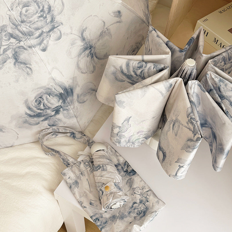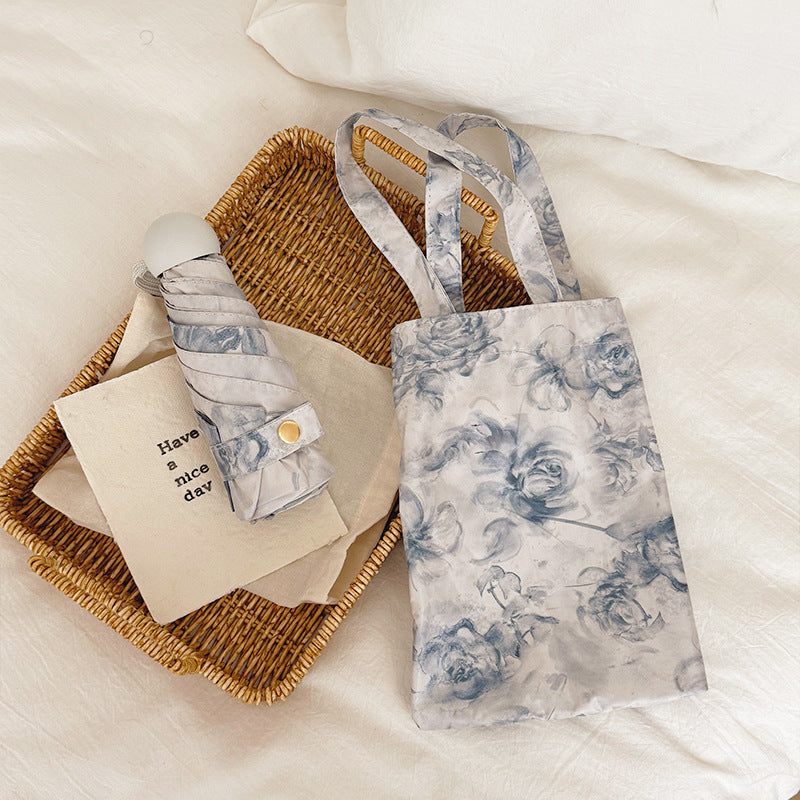 Haze Blue Flowers Mini 5-Fold Umbrella - Portable, Anti-UV, Black Glue Coating