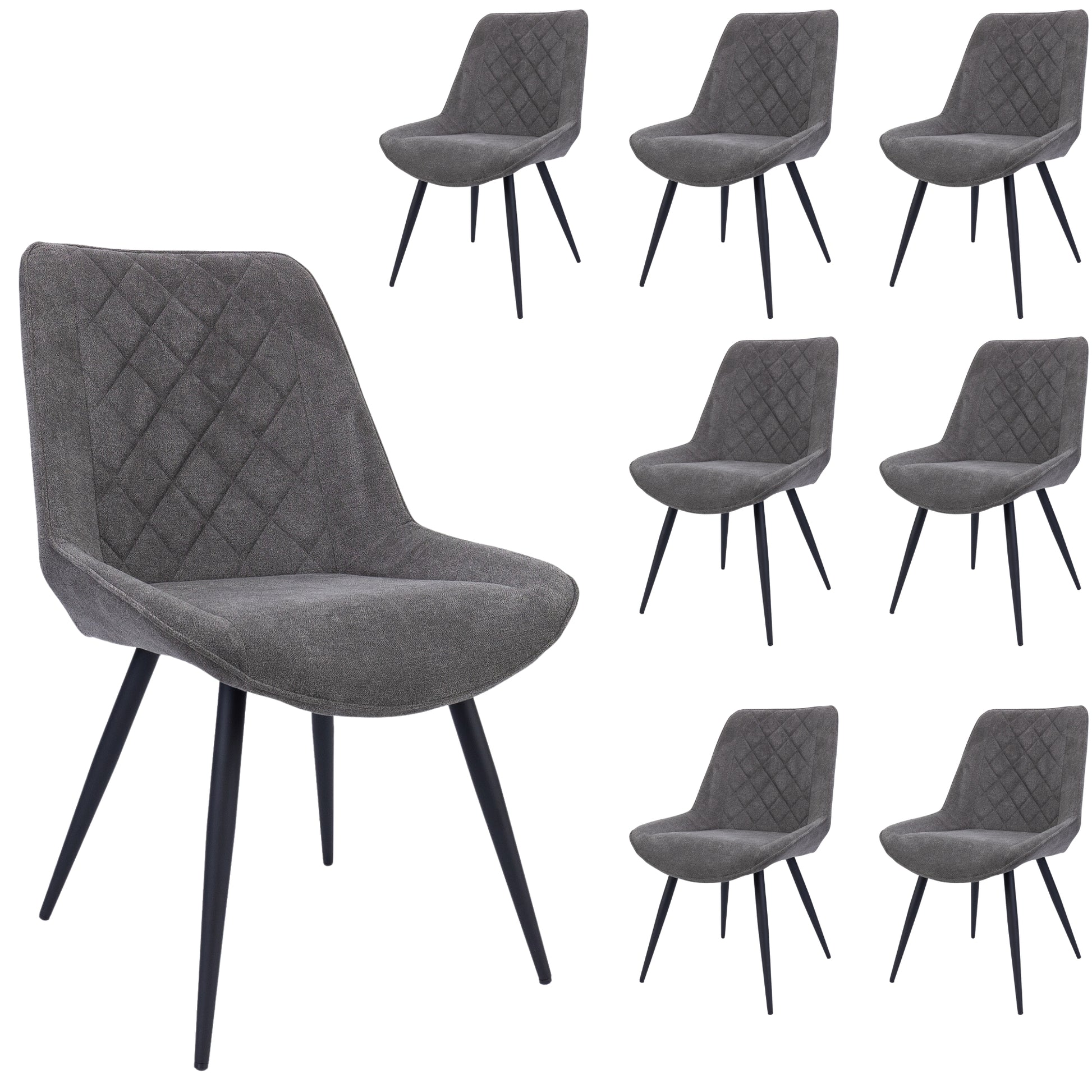 Comfortable dining chairs make cosy dining areas. To enjoy this cosiness, add this beautiful 8-piece set of dining chairs to your dining area. Designed in the Scandinavian style, the chairs are upholstered in polyester fabric and have strong, tapered, black legs made of black powder-coated steel. A padded back makes them even more comfortable, giving them a unique look. The chairs look stunning in all decor settings, thanks to their inviting shape and graphite-coloured fabric upholstery. A metal frame gives them great strength. A one-year warranty is included with the fully assembled chairs.