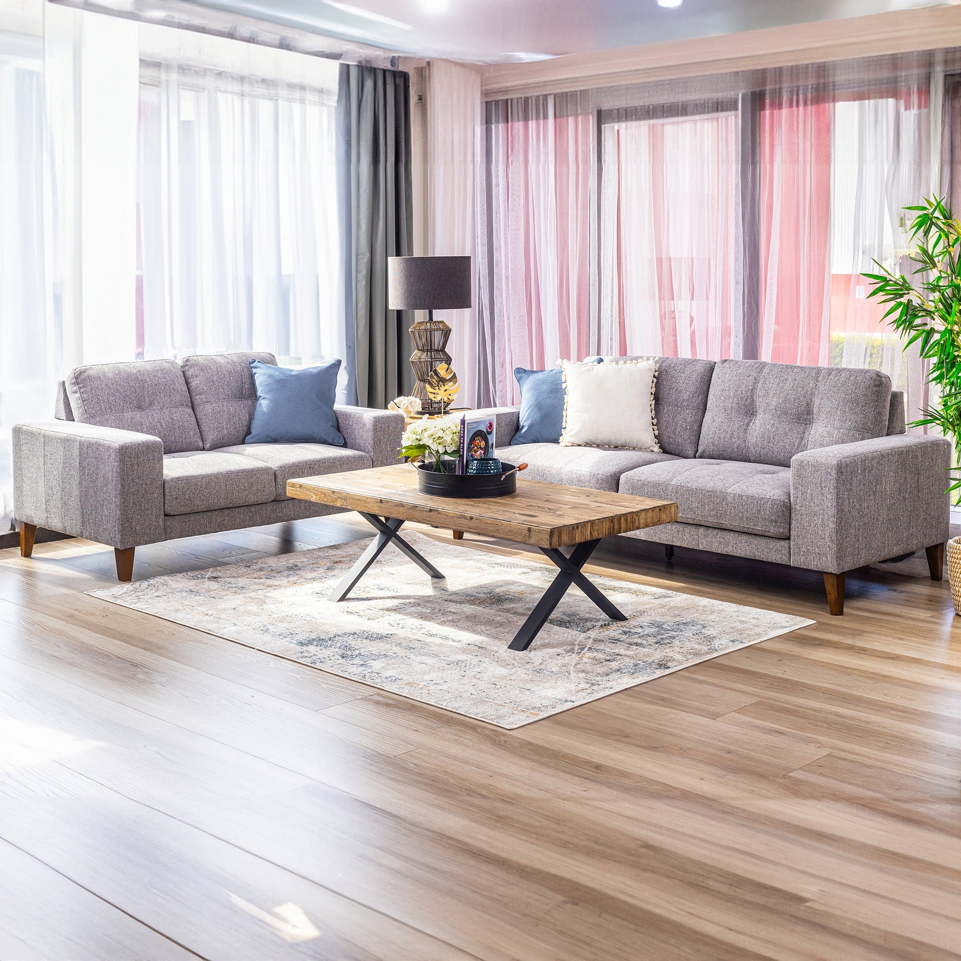 This good-looking and enormously comfy 3+2-seater sofa set fills your space with cosiness. Designed in a Mid-Century style, the sofa set has fine tufting details and a square frame for a modern touch. Fully upholstered in top-quality, 100% polyester fabric in grey colour, the sofa set looks gorgeous amid any interior decor theme. Its structural frame is made of sustainably harvested LVL and MDF, with a seating support that consists of dense foam and zig-zag springs. Rubberwood legs in walnut colour give a beautiful look to the sofas. Due to the high-performance material, the easy-to-assemble sofas become strong and durable. It comes with a one-year warranty. The sofa set is just perfect for living areas, game rooms, family rooms, children’s rooms, guest rooms, entertainment rooms, home theatre areas, and offices.