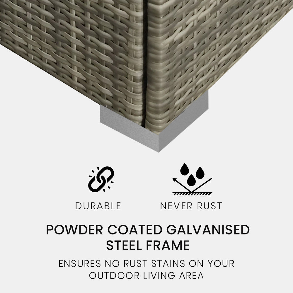 The London Rattan 3 Seater Outdoor Lounge Set with Coffee Table is a stylish yet affordable setting designed to provide utmost comfort. The London Rattan outdoor furniture setting has a durable galvanised steel frame with additional powder coating, ensuring no rust stains on your outdoor living area.