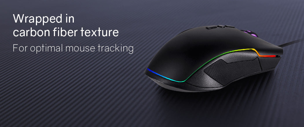 The desktop is wrapped in carbon fiber texture which not only looks the goods, but ensures the ultra-responsive mouse tracking you need to stay at the top of your game.