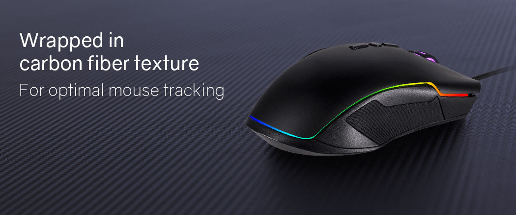 The desktop is wrapped in carbon fiber texture which not only looks the goods, but ensures the ultra-responsive mouse tracking you need to stay at the top of your game.