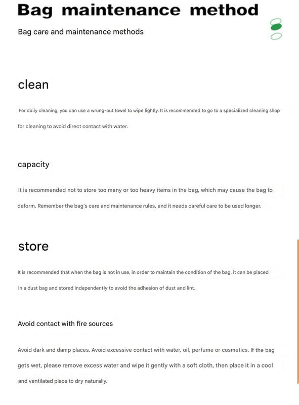 - Avoid Contact with Heat/Fire Sources: Avoid placing in damp, humid areas. Avoid excessive contact with water, oil, perfume, or cosmetics. If the bag gets wet, remove excess moisture and gently wipe with a soft cloth, then let it air dry naturally in a cool, ventilated place.