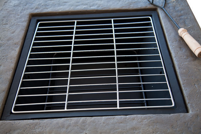 Enjoy the outdoors with this fire pit. Constructed with fiber glass reinforced cement, this fire pit is elegantly designed with natural stone and a d��corative frame finish. ?Adding this piece will bring warmth and elegance to your backyard or patio area, for those summer and winter nights