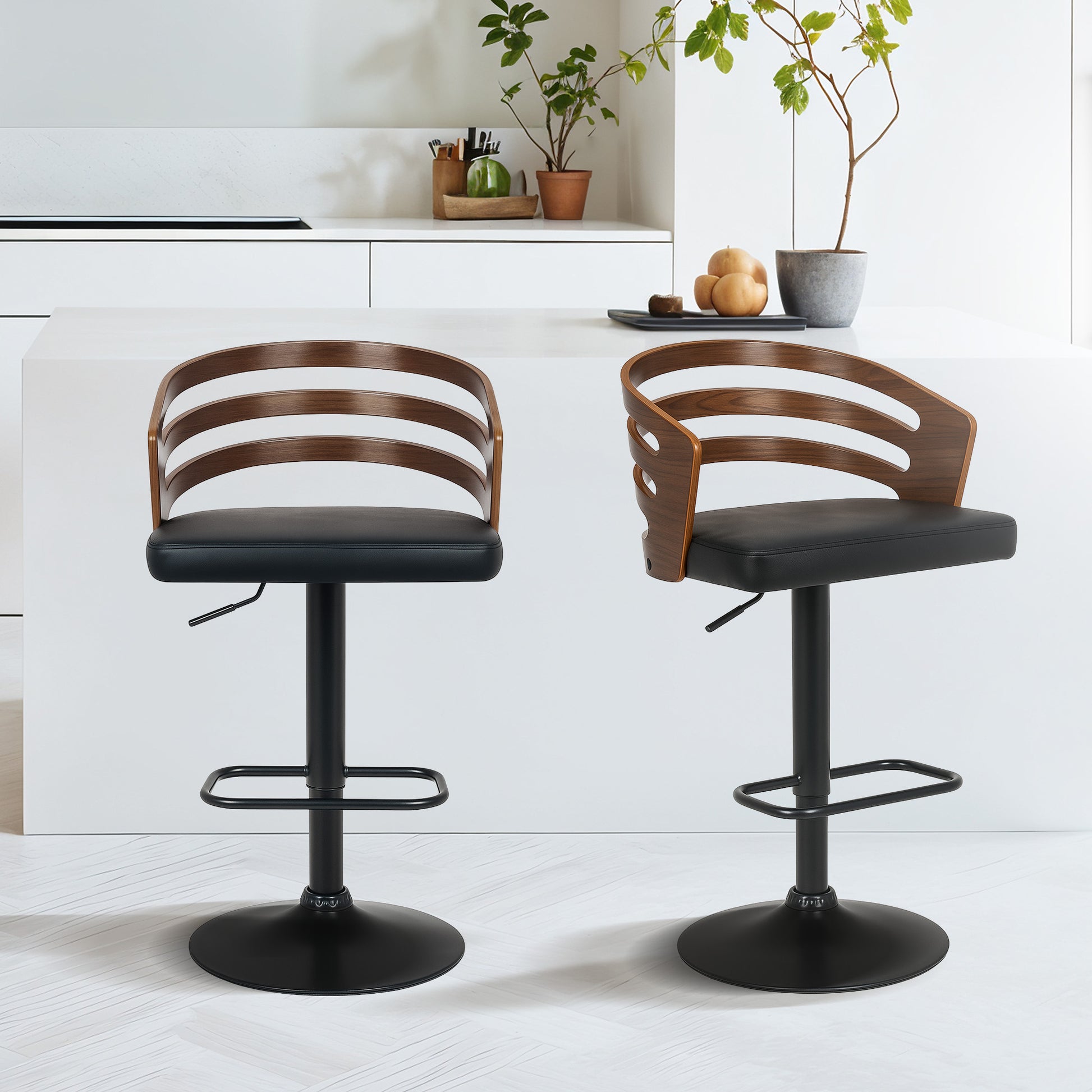 Functionality has never looked this refined. The Bentwood Barstool features a curved walnut backrest paired with a sleek black faux leather seat for long-lasting comfort. It's 360° swivel, gas-lift height adjustment, and heavy-duty powder-coated base offer adaptable support in any setting. With a water-resistant finish and versatile design, it suits kitchen counters, home bars or casual dining spaces.