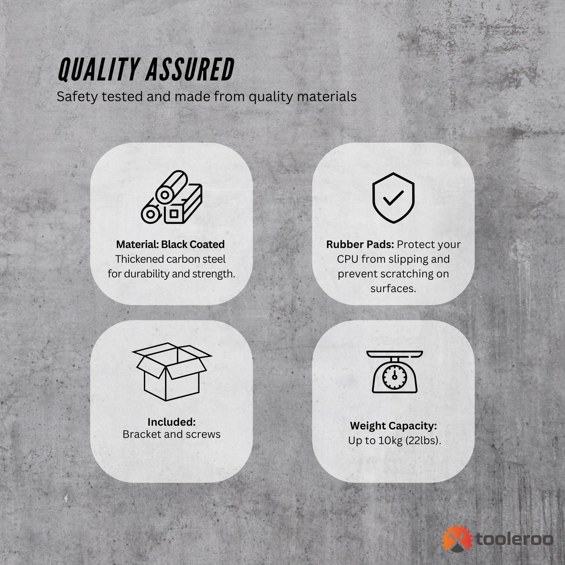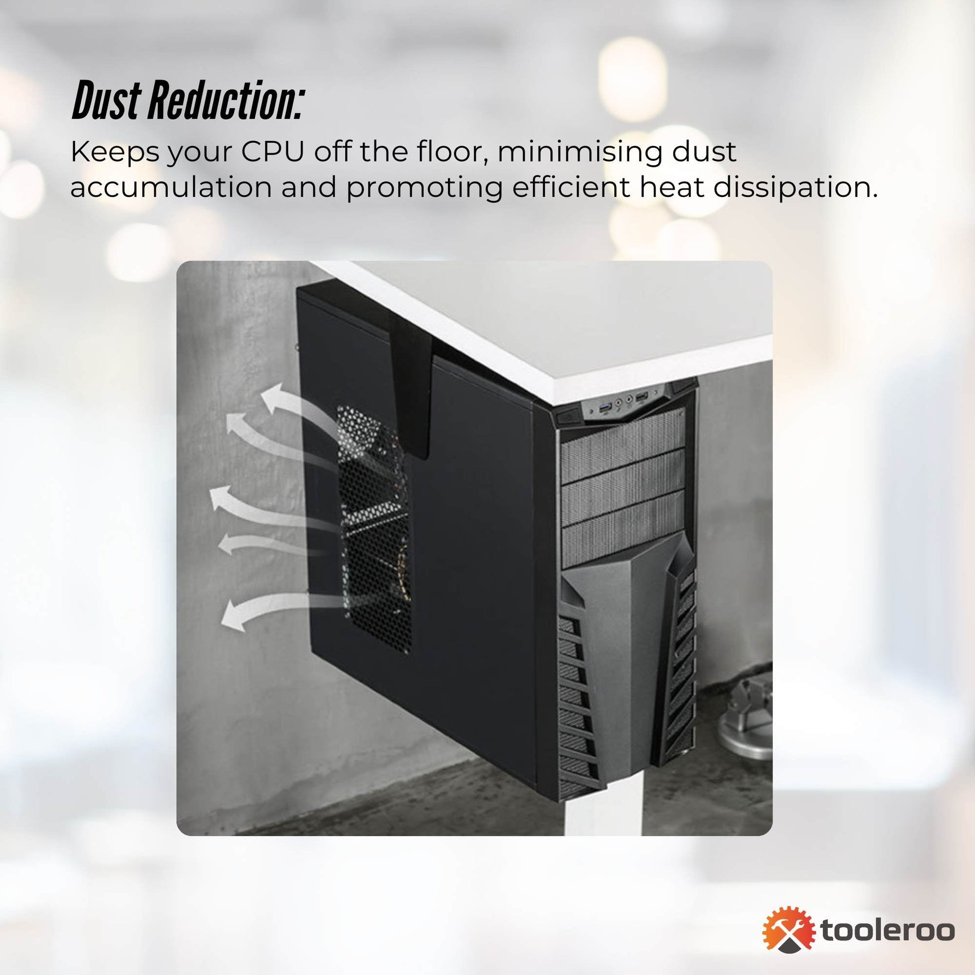 Revolutionise your workspace with the Tooleroo Under Desk CPU Mount, designed to provide convenience, organisation, and durability. With its adjustable design, 360° swivel mechanism, and robust construction, this computer tower stand is the ultimate solution for mounting your CPU securely under your desk.