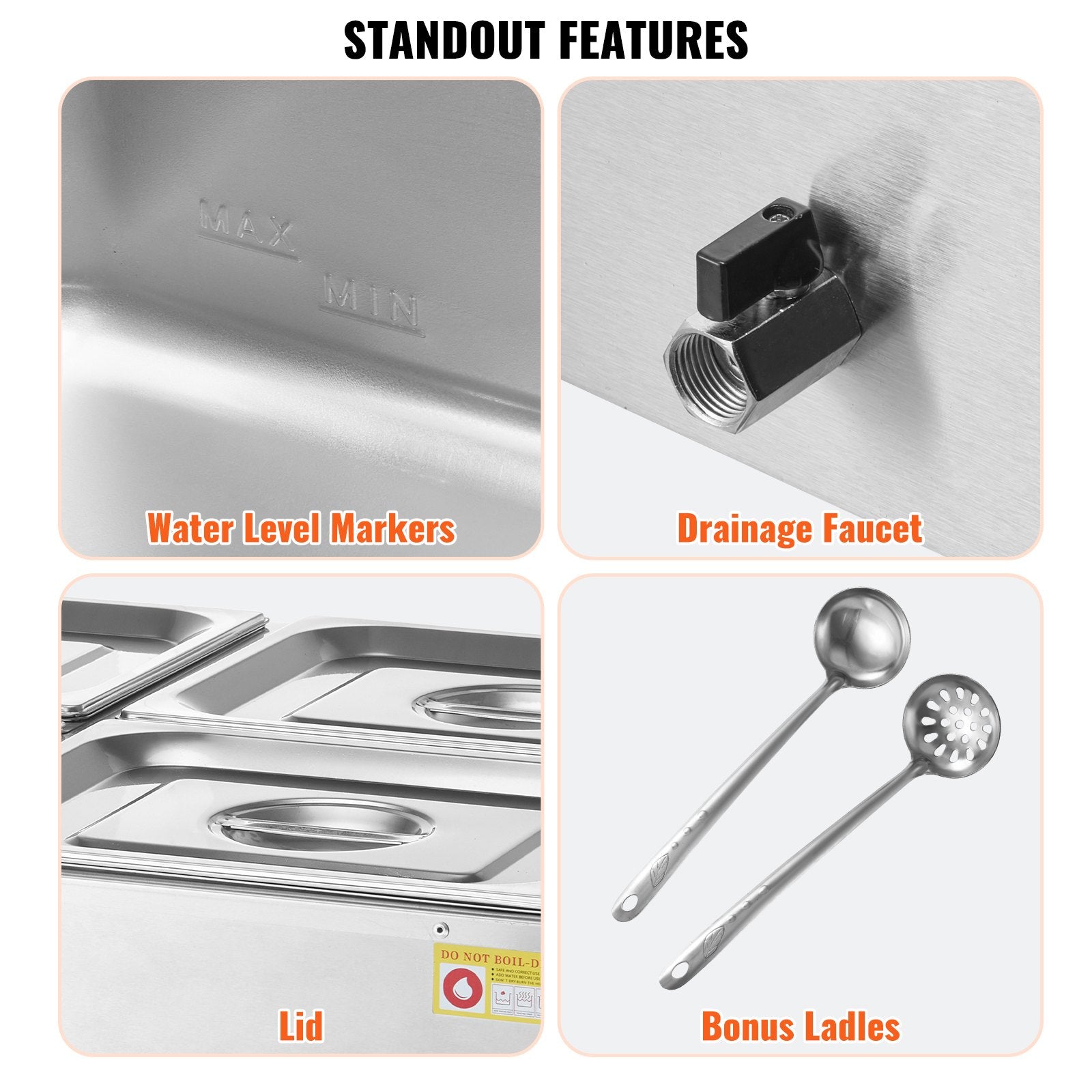 Our commercial food warmer comes with 4 x 8qt food pans accompanied by their respective lids, allowing you to serve different dishes simultaneously. Feel free to change up your menu from soups and sauces to stew, or even nacho cheese and chocolate.
